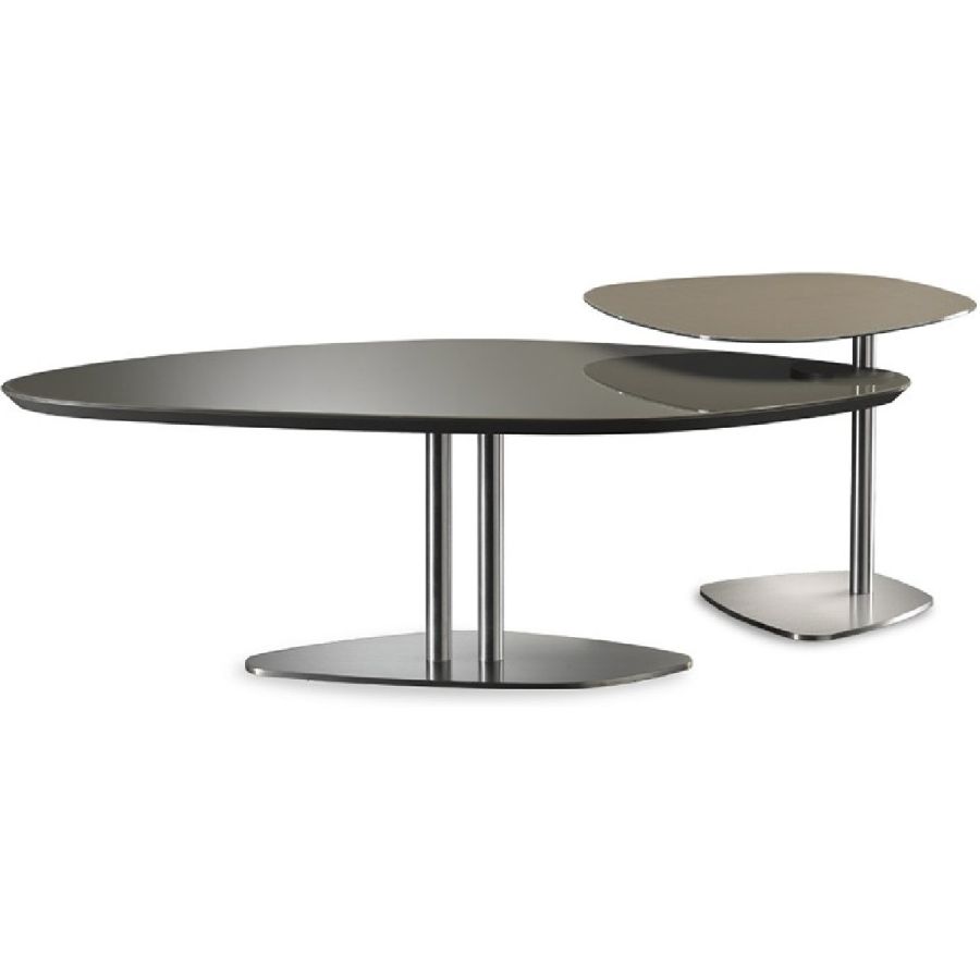 Collection of low and side tables with shaped top and metal base in various heights. Top in 10mm thick glass lacquered, etched lacquered, Mesh glass or Marmoreflex/Legnoreflex. Top also available in 25mm thick Bevel Wood in Canaletto walnut/Canaletto Henné or in satin brass, dark brass, titanium finishing.