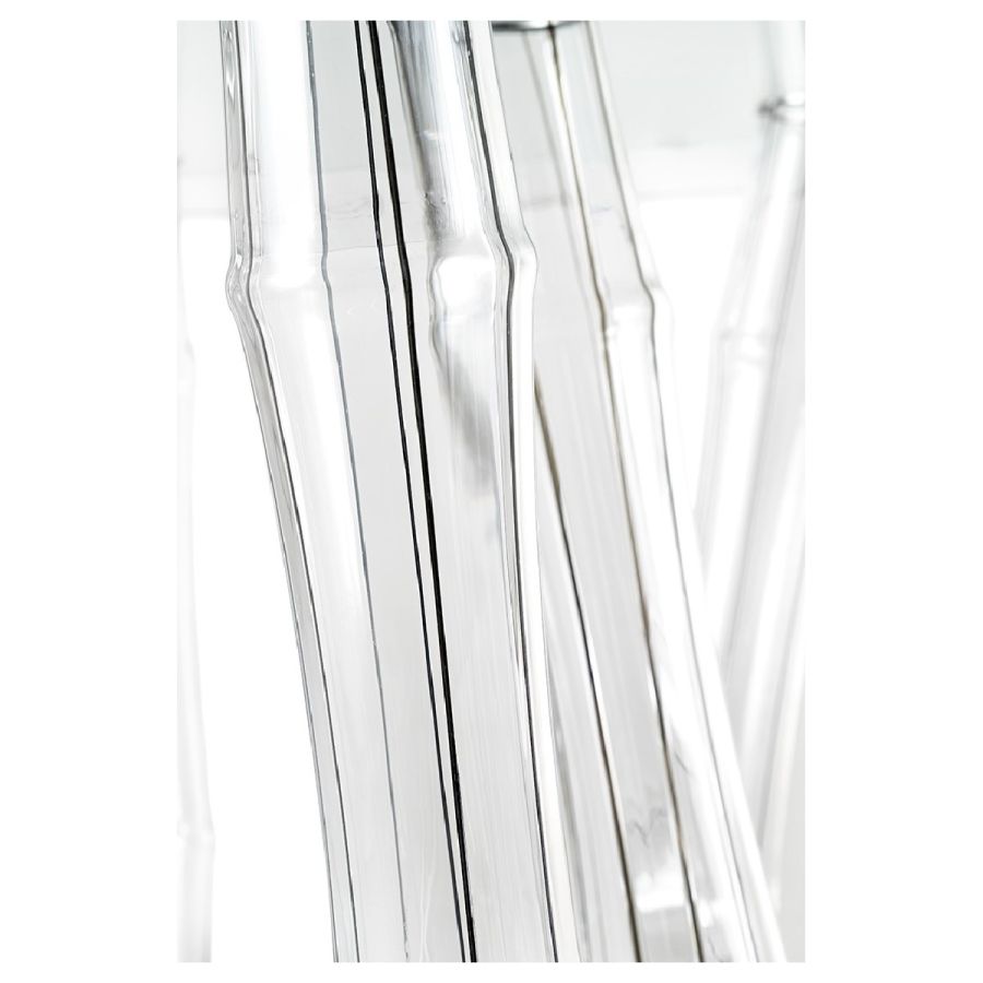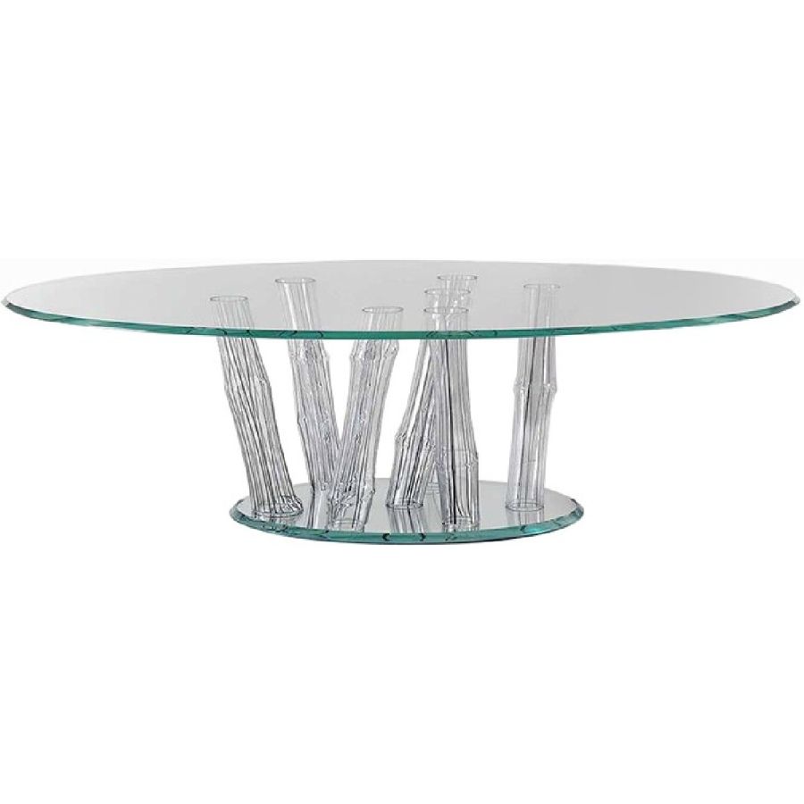 Coffee table with base made of transparent Murano glass tubes with Tortora filigree and plinth in smoke-grey mirror glass. Top in extraclear 12 mm thick glass.