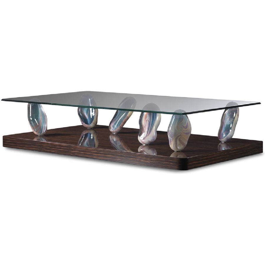 Coffee table with wooden base in shiny Ebony or in shiny lacquered finish standard colour or Venezia colours. Legs in Murano glass in Calcedonio or amber colour. Top in extra-clear glass 12mm thick with 45° bevel and rounded corners R50mm