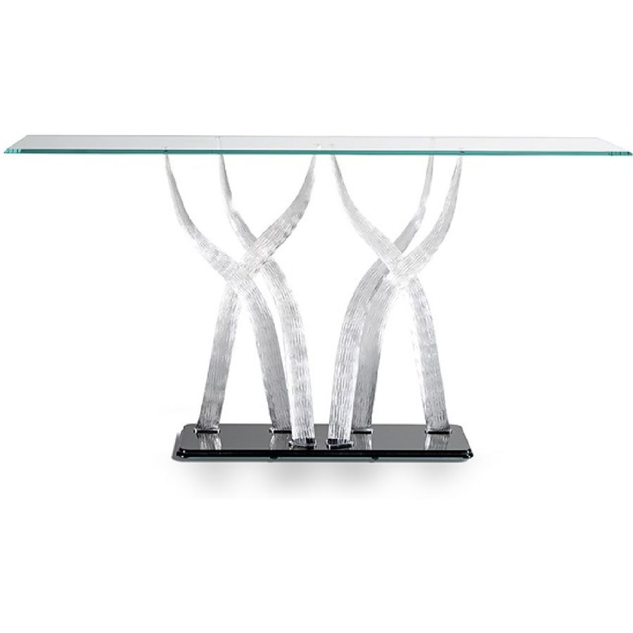 Console with base in transparent or pure gold Murano glass elements and plinth in black glass. Top in extra clear glass 12 mm thick with 45° bevel.;