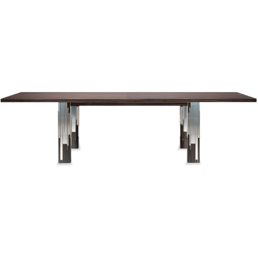 Dining table with wooden top 40 mm thick in shiny Ebony or shiny lacquered finish. Wooden legs with shaped decorations in shiny lacquered or in glazed steel with details in satin gold metal.