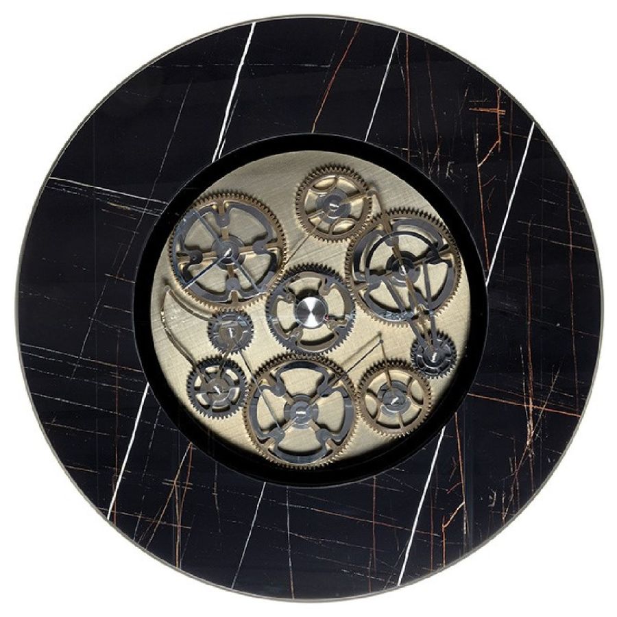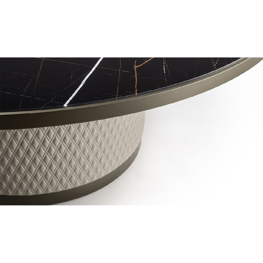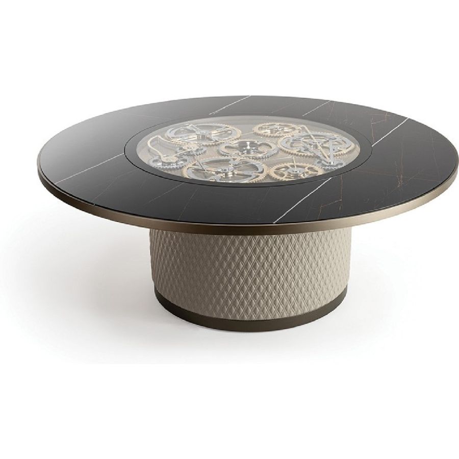 Dining table with cylinder-base upholstered in leather CAT.C or NABUK with quilting. Wooden top 40mm thick with a cover in Marmoreflex/Legnoreflex. Edge of the top and bottom section of the cylinder in the metallic finishes (Bronze (100M), brass(104), dark brass (105M9, titanium (101M). Built-in Lazy Susan in transparent glass with gears in shiny gold and chrome on a bottom in Mesh glass. Optional electrical motor for the Lazy sausan mechanism.