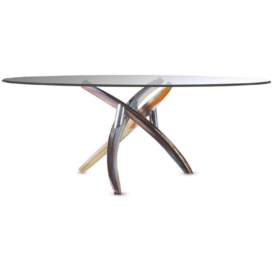Dining table with Murano glass base in Rugiada or Calcedonio finishing or in gold and Murrine. Top in transparent glass top 15 mm thick.