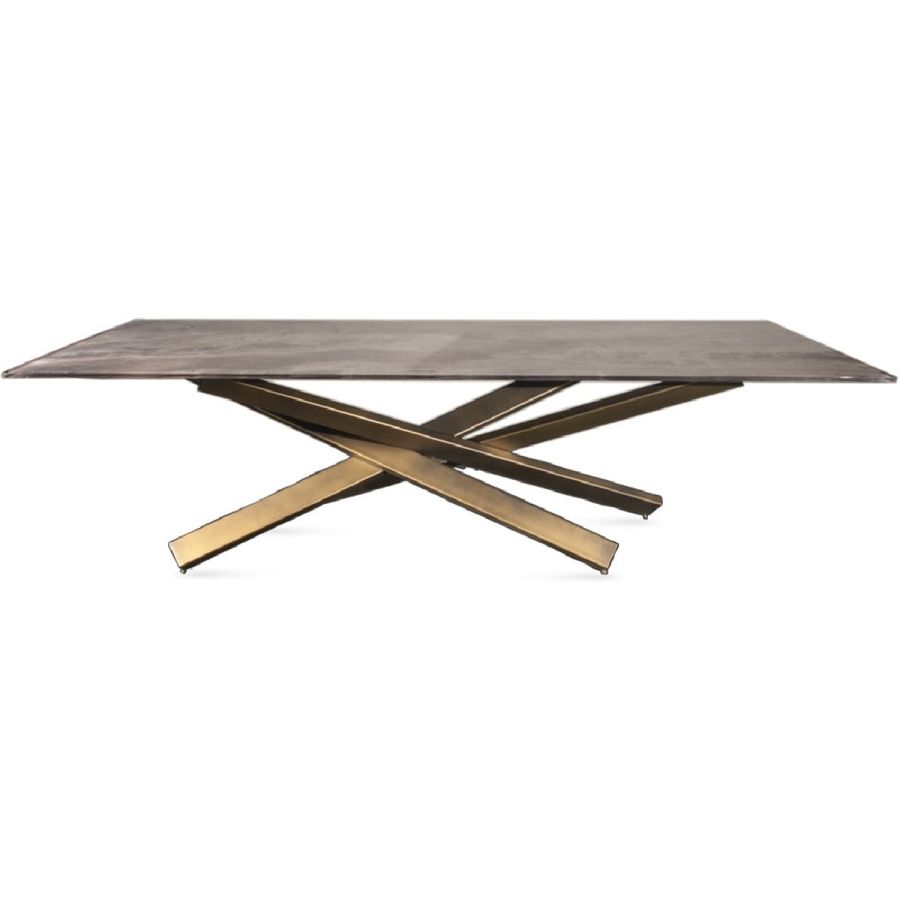 Dining table with iron base available in Bronze or satin brass or titanium finishing. Top available in glass, smoked glass or in Marmoreflex/Legnoreflex glass. Top also in bevel wood 40mm thick with a cover in MarmoReflex/LegnoReflex glass.