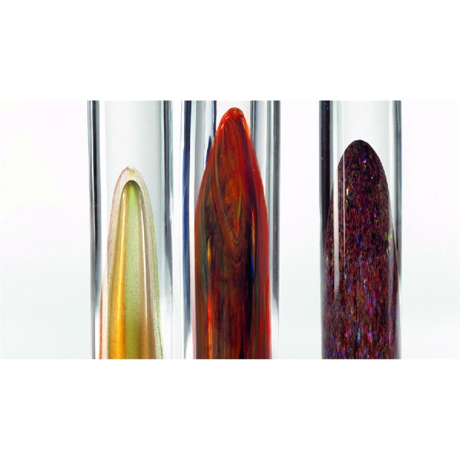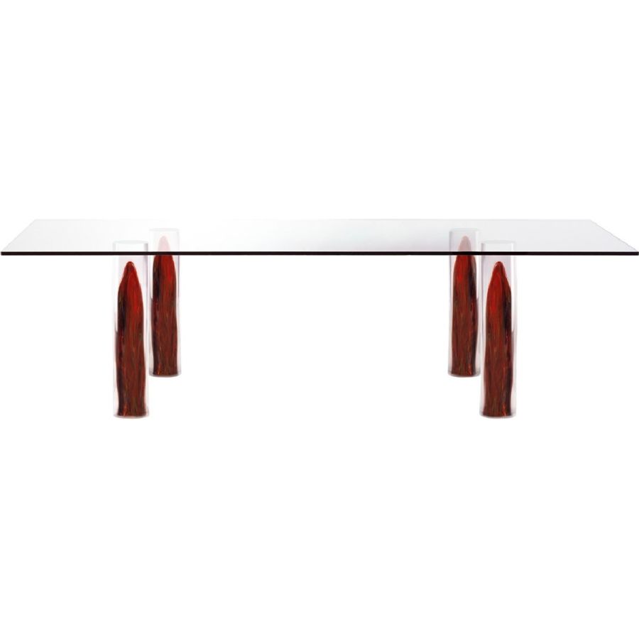 Dining table with base composed by Murano glass columns in Oro, Murrine and Striato finishing. Top in extra-clear 19mm thick glass