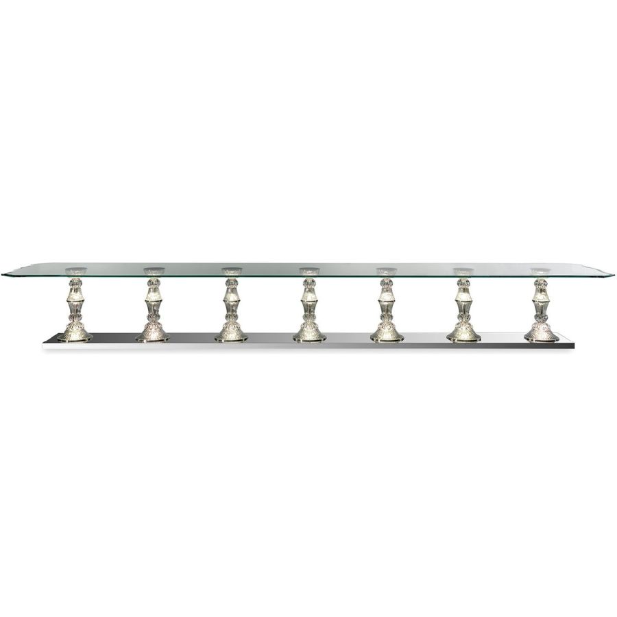 Dining table with legs made of various elements in engraved crystal on a plinth in extra clear mirror glass. Top in extra clear glass 19mm thick with shaped sides. LED lighting in each leg with rechargeable battery. Can be made in various sizes and shapes, up to 6 meters long.