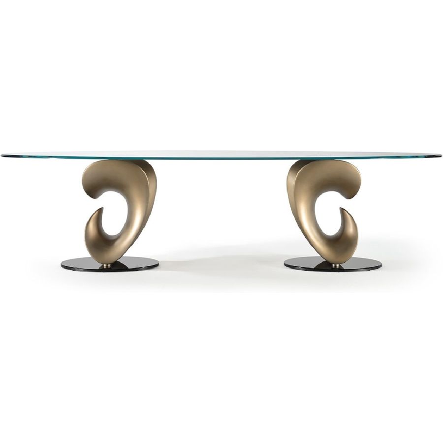 Dining table with bases in satin finish brass, dark brass, titanium and plinth in smoked mirror glass. Top in 15mm thick extraclear glass.