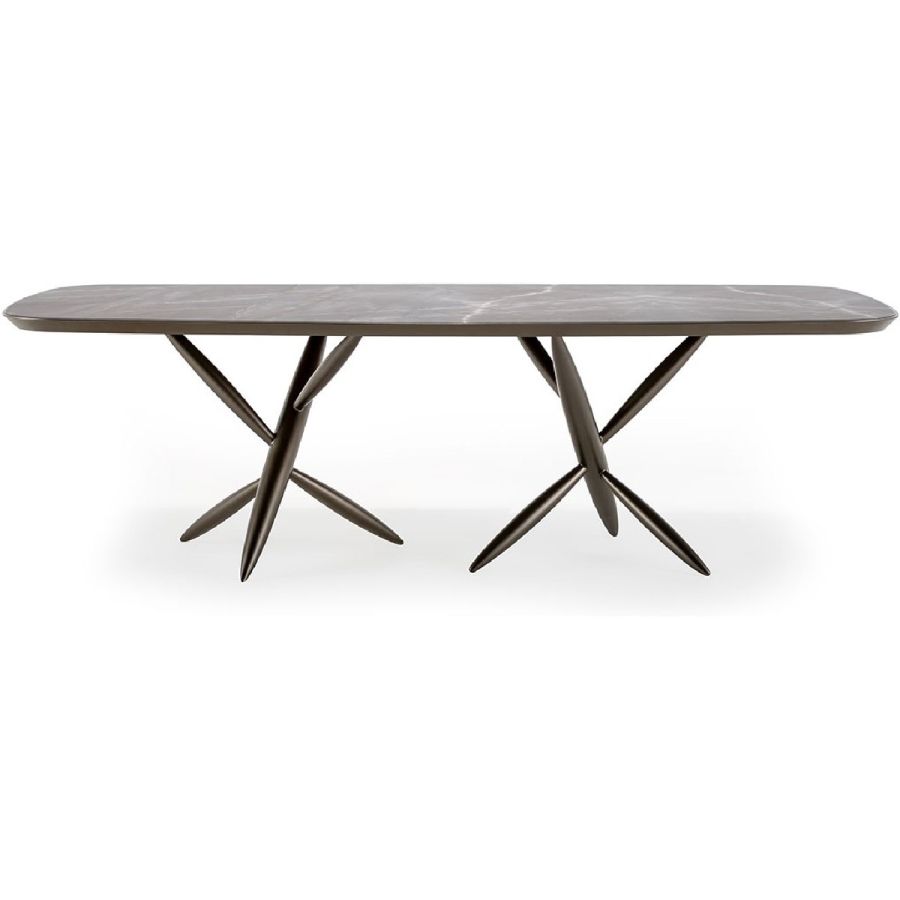 Dining table with base in composite material in Bronze finish. Top in transparent glass, extra-clear glass, in MarmoReflex/LegnoReflex. Also available with Bevel Wood top in Canaletto or Canaletto Henné or in bronze finish with cover in Mamoreflex/Legnoreflex