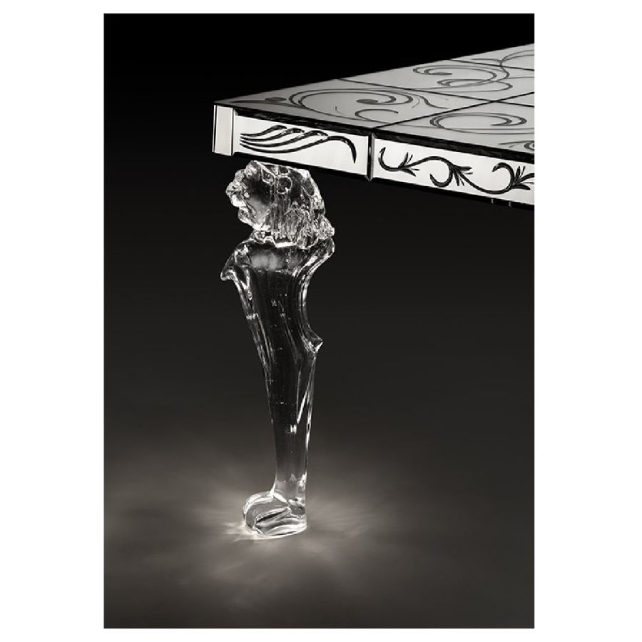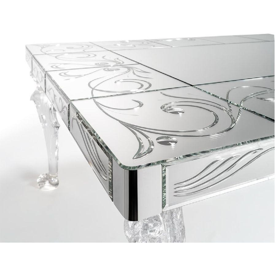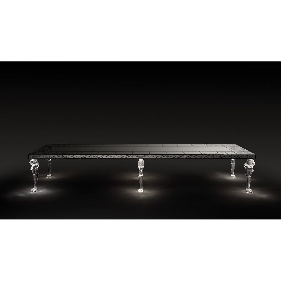 Dining table with base made up of legs in solid transparent Murano glass with Led lighting. Top covered by tiles in extra-clear mirror glass with artistic engravings.
