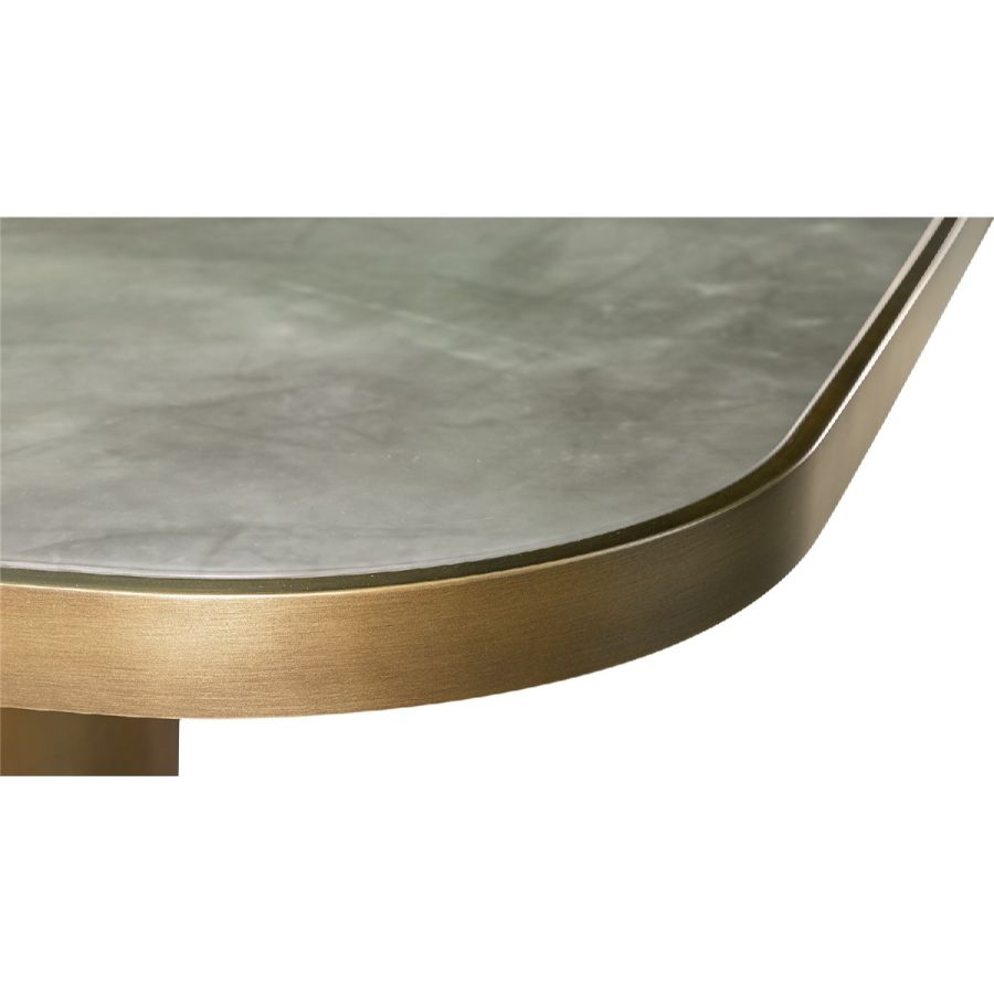 Dining table with base composed by ten cylinders in satin Brass finish. Wooden top in matching finish with 40mm thick edge and with Marmoreflex inlay. Bespoke dimension: 550 x 230 x 75h cm