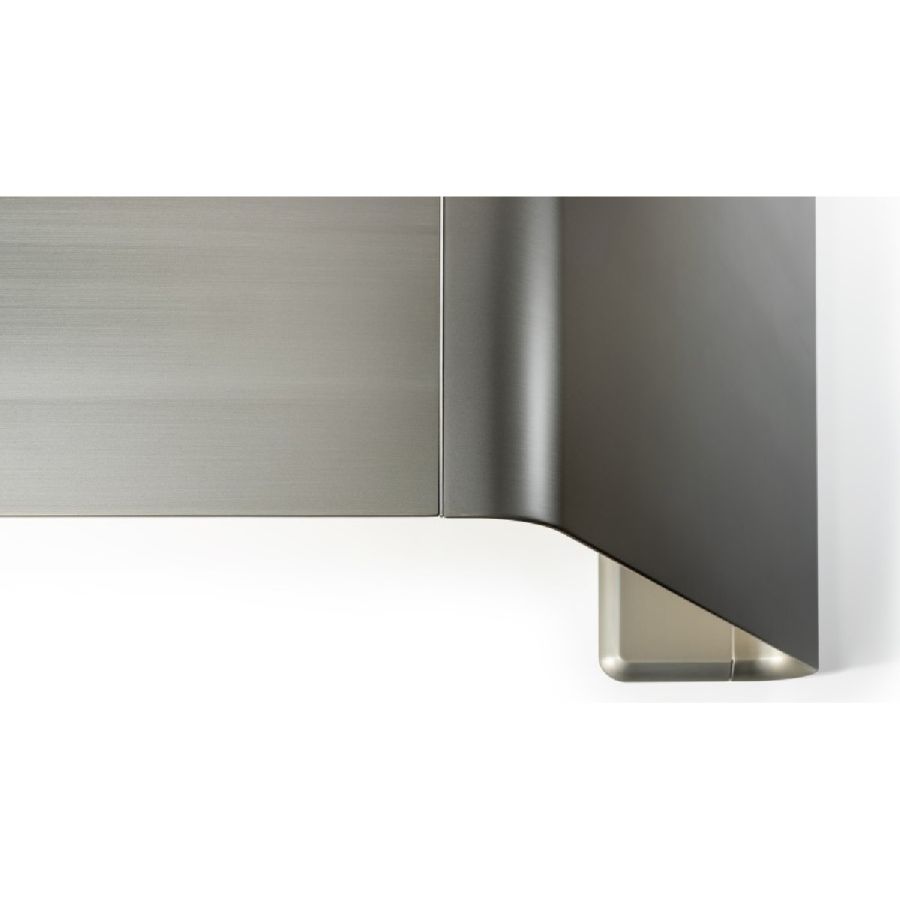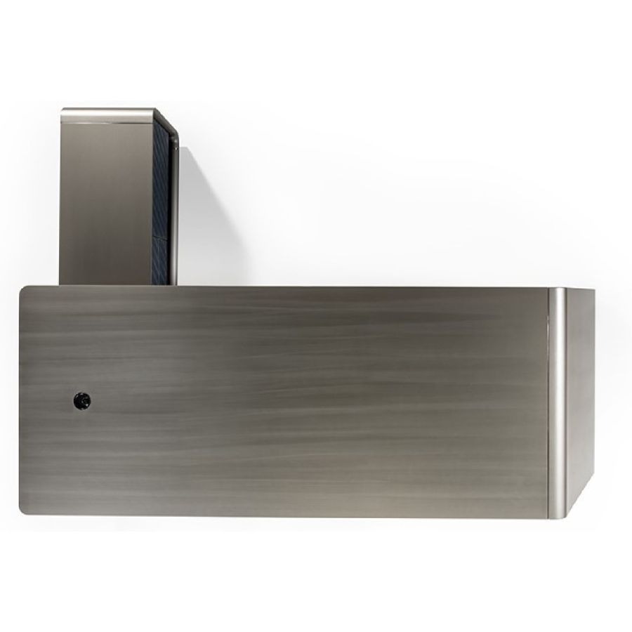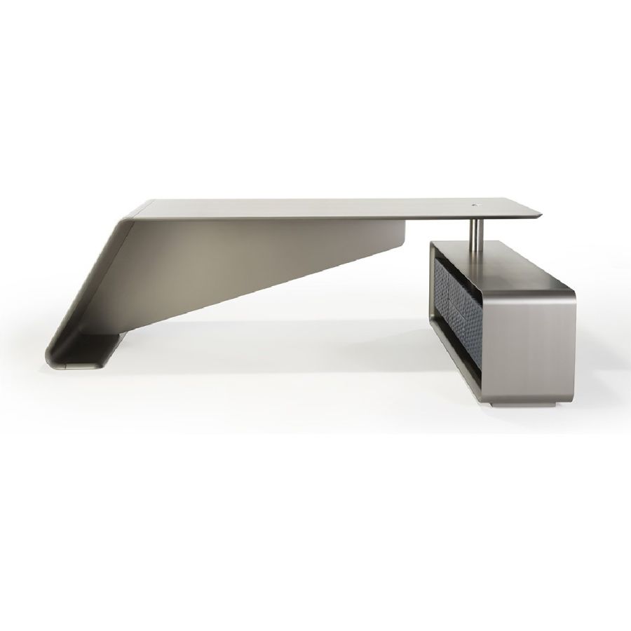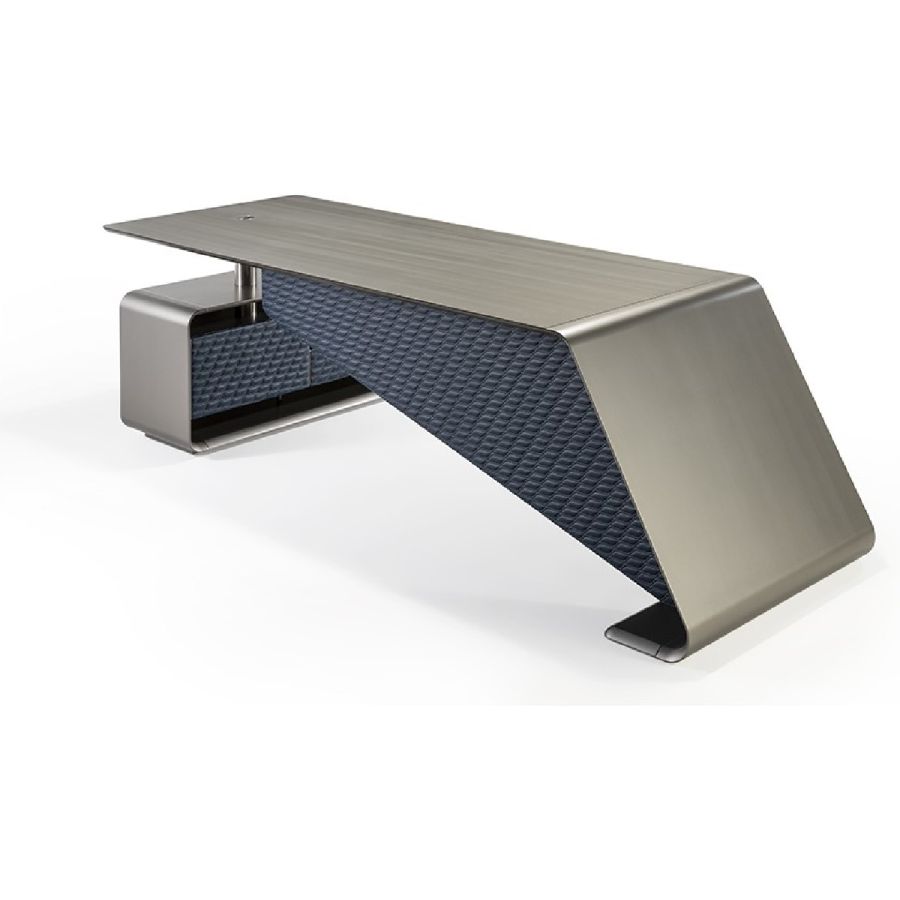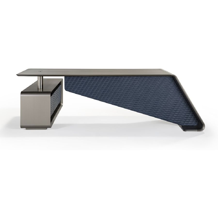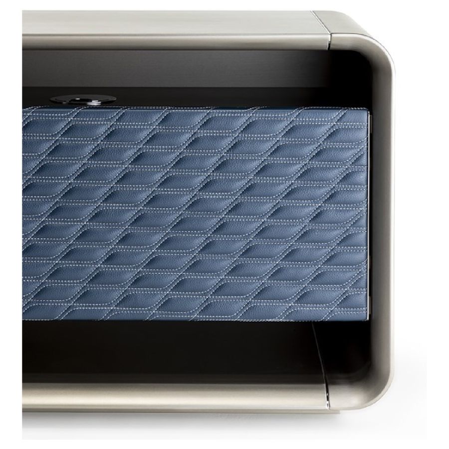 Side container with 2 drawers and 2 doors covered in quilted leather (matching front panel). Painted glass matching the structure on the top of the desk and the drawer unit.