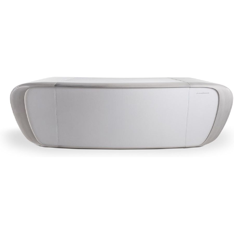 Desk with curved structure available in satin brass, dark brass, titanium or copper finish or shiny lacquered Venezia colours. Front section covered with leather. Top covered with leather or in same finish as the structure with cable-hole. Equipped with 2 drawers and 2 filing drawers