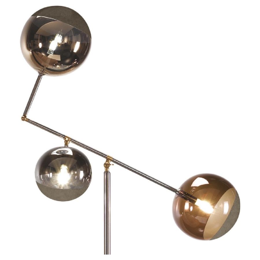 Floor lamp with metal structure in satin finish brass with adjustable inclination. Details in brass. Spheres in borosilicate glass with shaded sputtering finish : 1 x Ø16 cm in silver - 2 x Ø20 cm in gold and bronze or 3 x Ø18 in Pulega finish . LED lighting