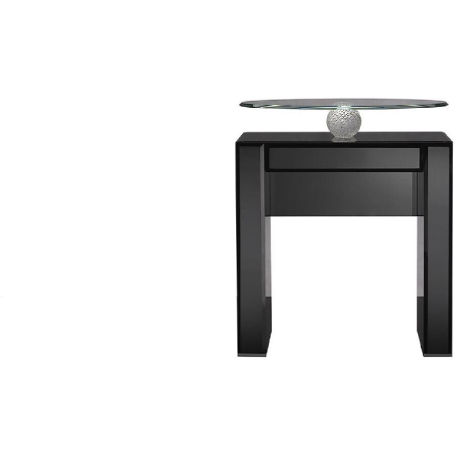 Nightstand with 1 drawer in wood available in shiny lacquered with bevelled lacquered glass details or in shiny Ebony. Upper oval top in extra clear glass 10mm th. supported by a sphere in transparent or gold Murano glass with LED lighting.