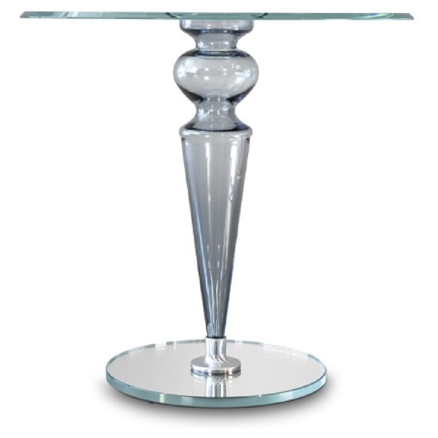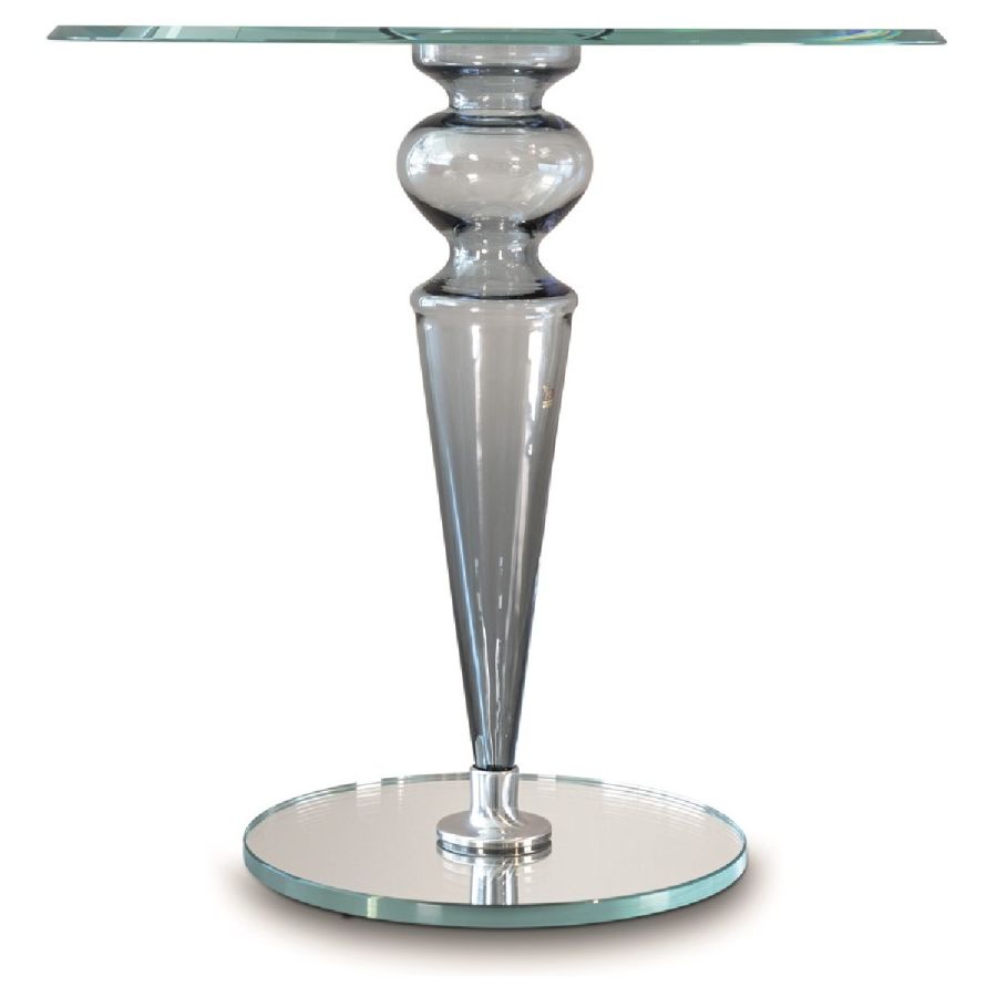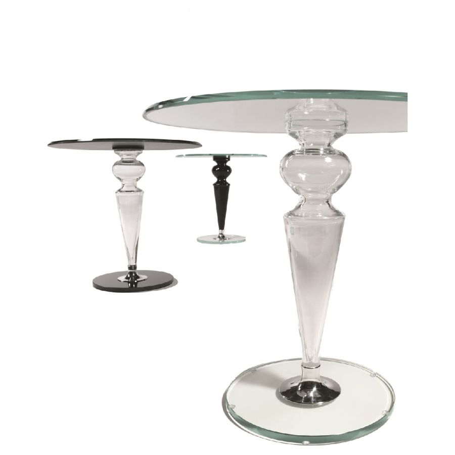 Side table with leg in smooth Murano glass transparent or in colors black, blue-gray, red, amber, amethyst, tobacco colours. Leg also available in ribbed transparent or gold Murano glass. Base in transparent, black lacquered or mirror glass. 10mm thick transparent glass top.