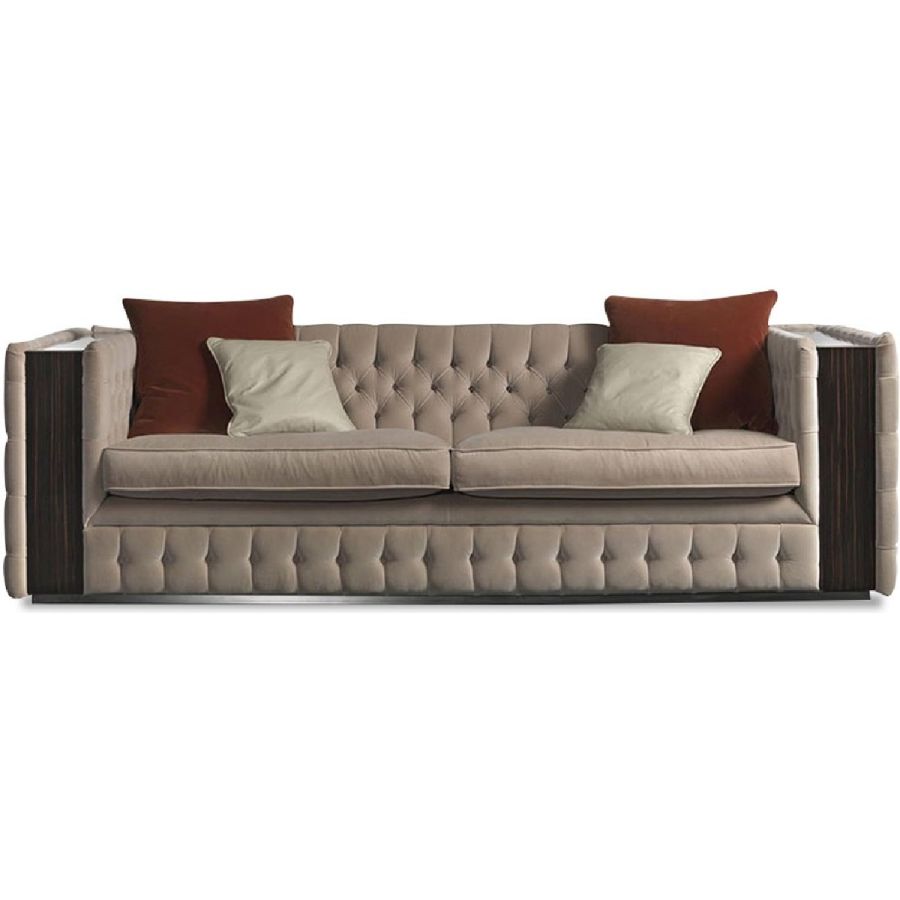 Sofa with wooden structure and feather padding with details in polyurethane foam. Base in polished stainless steel. Bands in shiny ebony wood, in lacquered glass or in Antique mirror with golden engravings. Upholstery in fabric or leather, studded on both backrest and arms, inside and outside.