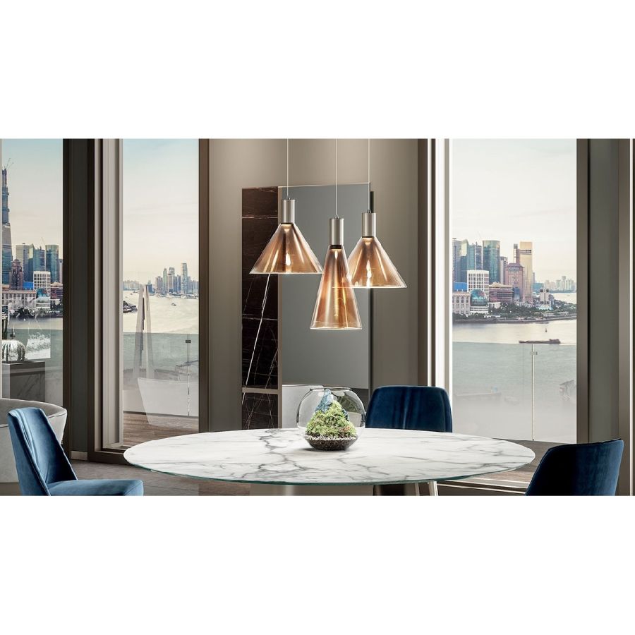 The Accademia collection, born with the tables, is enriched with pendant and table lamps. Two dimensions to create dynamism and rhythm, two functions both as table lamps and as pendant lamps. Glass shade in sputtering shaded finish copper, bronze or silver.