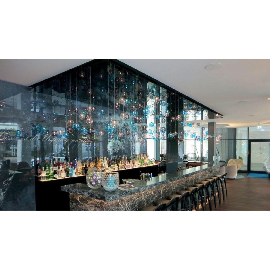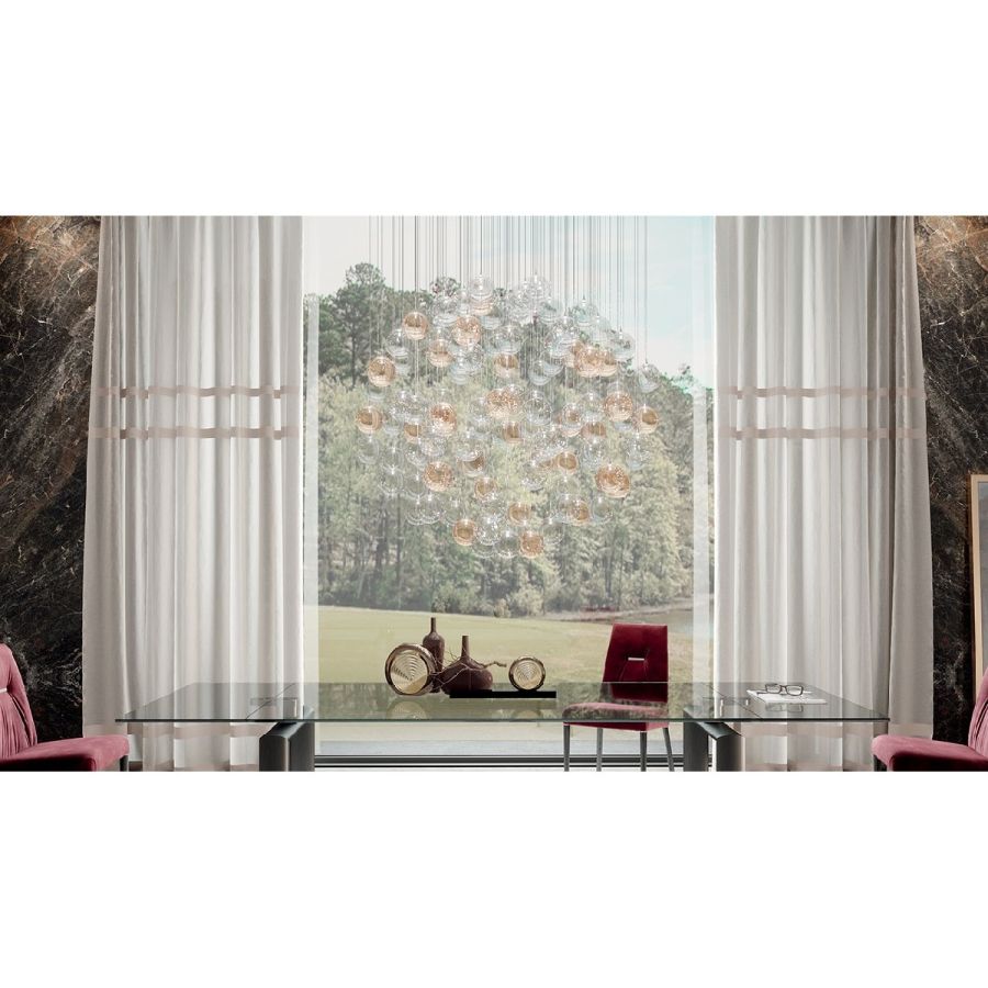 Lamp with ceiling support in white, black or mirror glass and suspended spheres in clear smooth borosilicate glass with led bulbs inside. Allows various types of customizations for dimensions and shapes. Available as single pendant lamp and with coloured spheres.