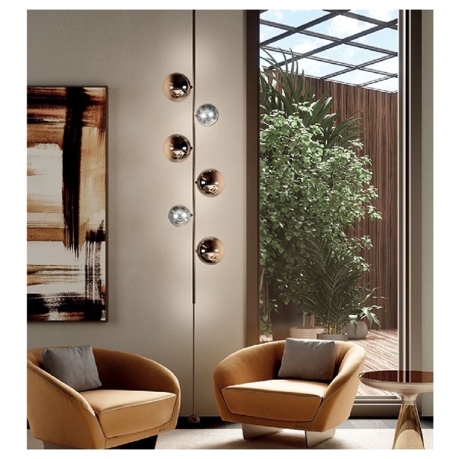 Suspension lamps that complete the Bulles XL collection. Metal structure in bronze finish. Spheres in borosilicate glass in 3 different sizes in shaded sputtering bronze, silver, gold or copper finish with LED