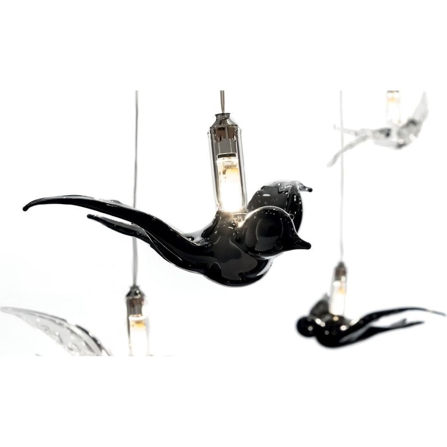 Chandelier with black, white or mirror glass support and pendant swallows in transparent and black Murano glass with internal Led. Available in various dimensions and shapes and can be customized for length and number of elements.