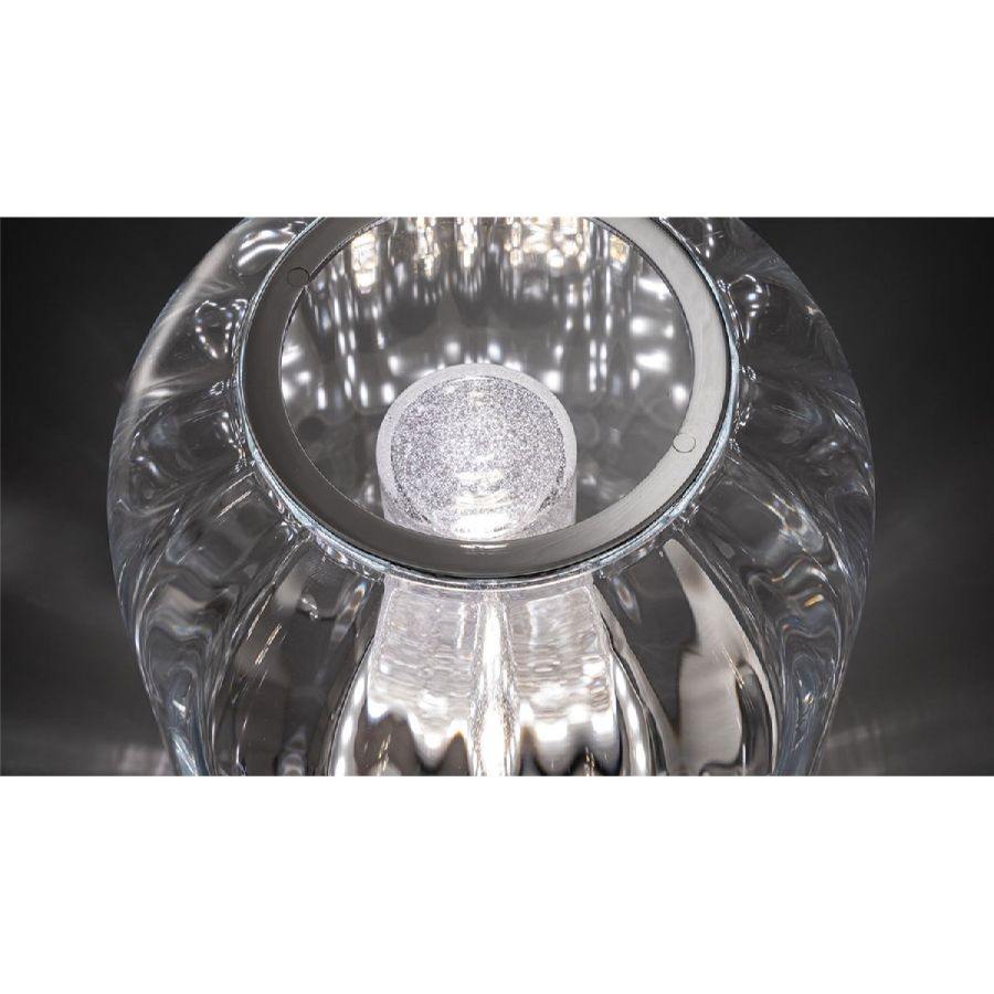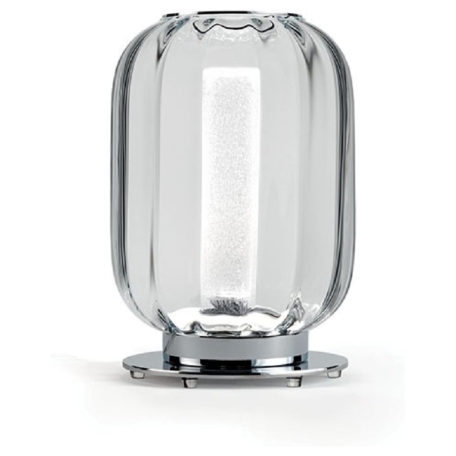 Table lamp in artistic glass in the colours: transparent, acquamarine, straw-yellow. Inner shade in Rugiana finish glass. Base in polished chromed metal. Magnetic glass cover. Led lighting with 3W GUA spot and 2W Strip