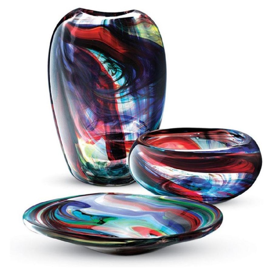 Coloured Murano glass vases and plate in 'Striato' finish.
