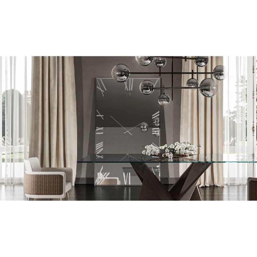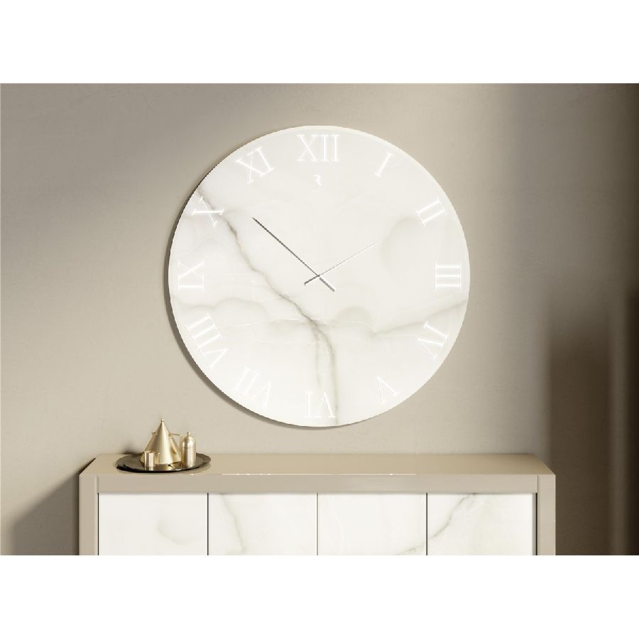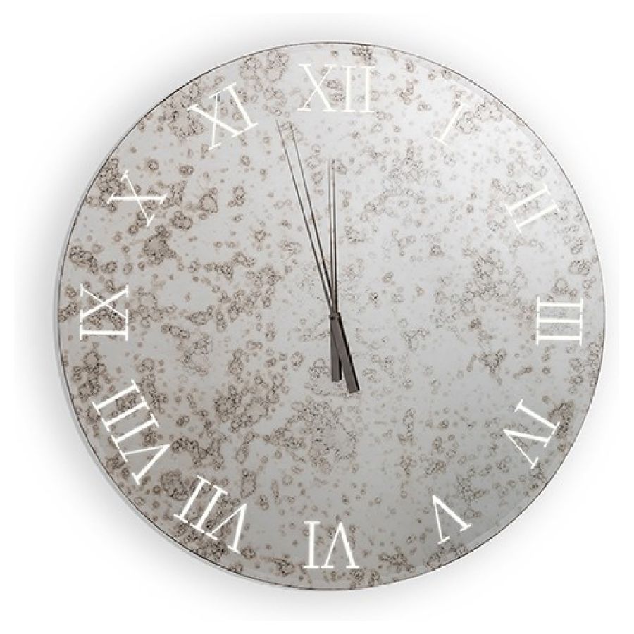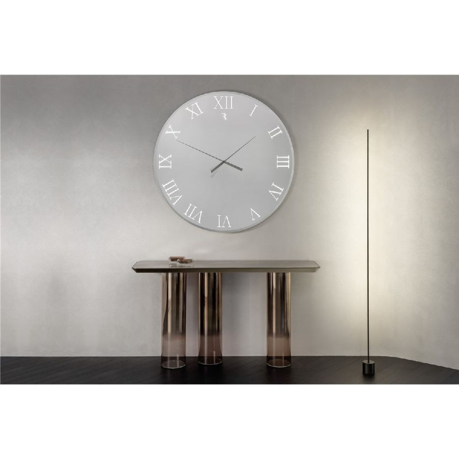 Round or rectangular mirror/clock in extraclear mirror glass with 20 mm bevel. Also available in smoke-grey mirror or in Antique Mirror or in Marmoreflex/Legnoreflex glass. Roman numerals in smoke-grey serigraphy and hands in titanium. Optional back LED lighting.