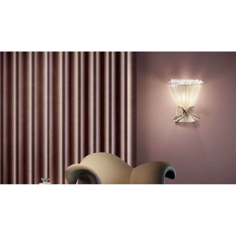 Wall lamp with iron support, lampshade in ivory pleated fabric and sandblasted glass cover with flower decorations in transparent Murano glass. LED system