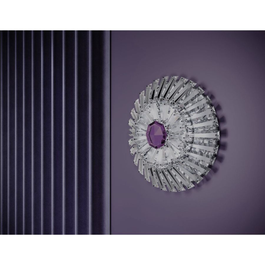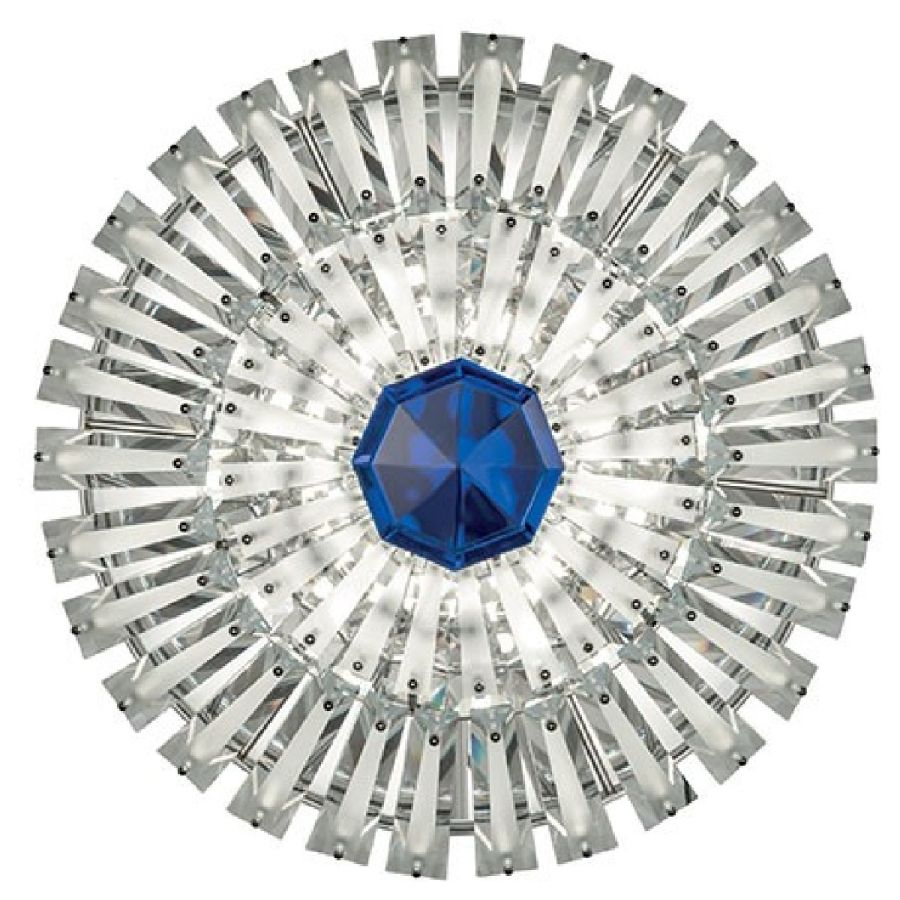 Wall lamp with frame in polished metal and extra clear etched glass prisms. Central diamond available in the colours red, blue, violet, bronze, fumé. LED lighting system