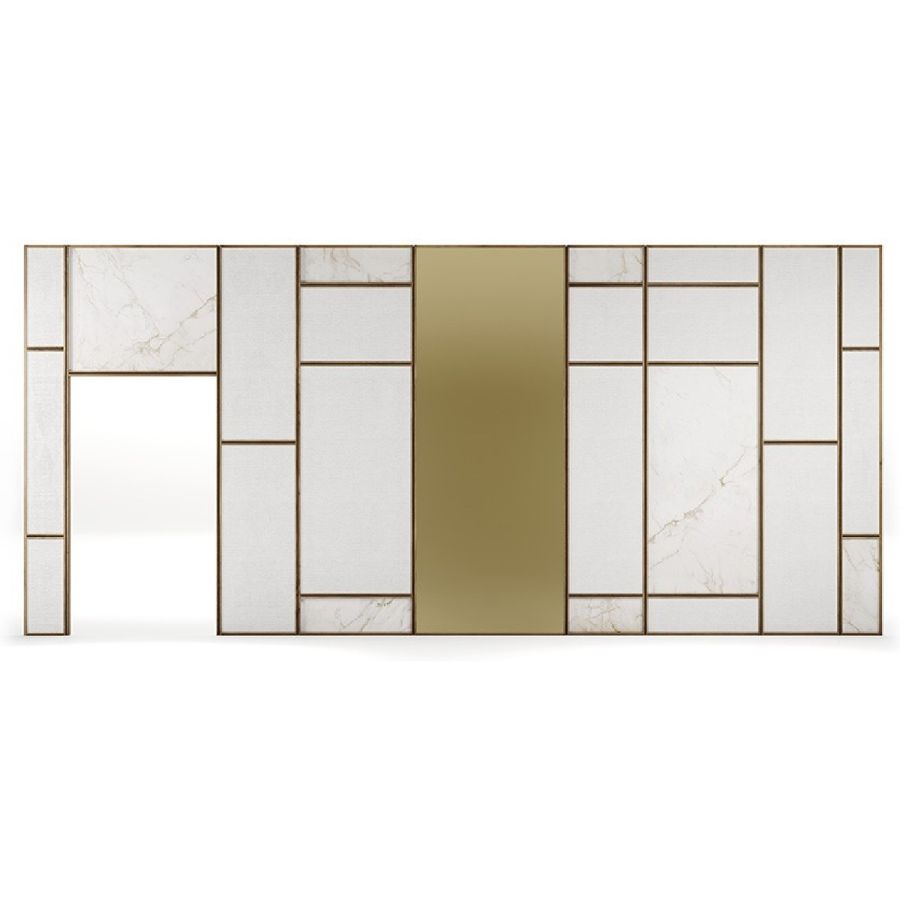 Modular system with wooden profiles and panels in wood, glass, or covered in fabric or eco-leather. Possibility to configure shelves, portal modules, and TV-ready modules for Wally Day System, and a wide range of accessories such as drawers and shelves with clothes rails for Wally Night System/Open Wardrobe.
