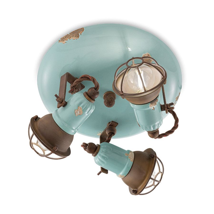 Taklampa med 3 lampor i vintagekeramikdesign med riktat ljus. Keramiken med vintagefinish, burarna på lampan och den oxiderade metallen gör denna taklampa unik och ger den en antik smak i loft- och industrimiljö.