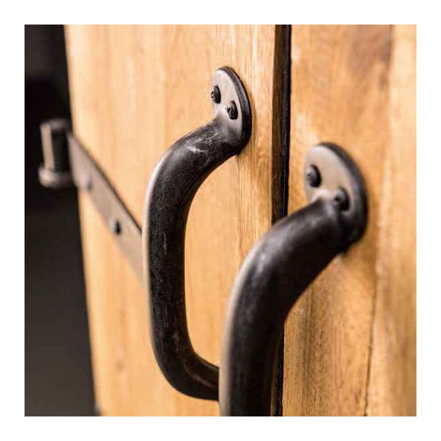 Ett skåp från kollektionen ”Industrial 8” av Robers är både multifunktionellt och imponerande elegant. Det fungerar som förvaring i hemkontoret, matsalen eller köket. Fyll det med de papper du behöver arbeta med, möbler eller dekorationer, eller kanske med flaskor av dina favoritviner. Skåpet är helt handgjort. Dess bas - sidopaneler, ben, och topp är av hårt stål, medan dörrarna och alla tre hyllor inuti är gjorda av ek i en traditionell oljad ekfinish. Varje del och liten detalj av detta skåp tillverkas av Robers erfarna smeder i deras egen anläggning i Tyskland. För att behålla skåpet i en verkligt industriell och urban stil beslutade formgivarna att dekorera det med många metallnitar och gångjärn för att möjliggöra öppningen av frontdörren.