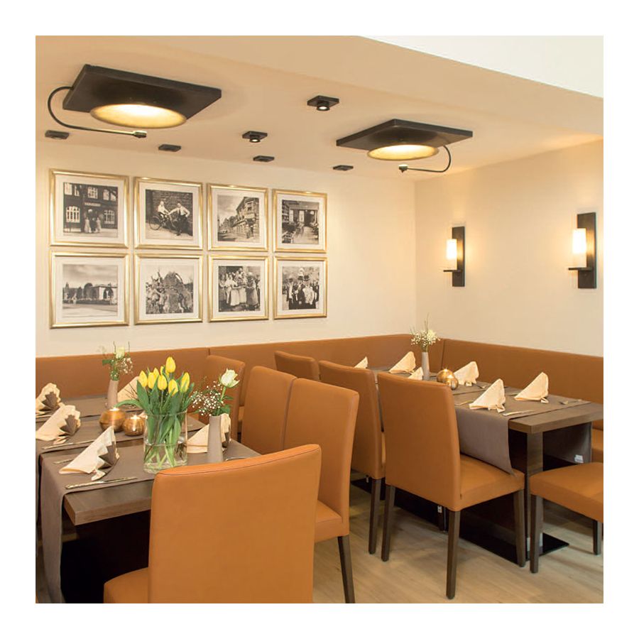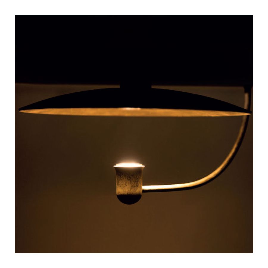 Denna taklampa från kollektionen “Indoor 16” är en elegant lösning som visar att den industriella stilen kan vara vacker med en glamorös touch. Särskilt när rummet är fyllt med andra belysningselement eller möbler i klassisk stil med varma färger och bekväm design. Den tyska tillverkaren Robers äger en fabrik där deras smeder tillverkar belysningsdelarna av järn, gjuten aluminium, koppar och varmförzinkat stål, alla handgjorda. Denna exceptionella taklampa har en ovanlig design: ljuskällan sitter inte under lampskärmen, utan på den böjda armen som samtidigt fungerar som ett dekorativt element. Principen är enkel: ljuset från en glödlampa reflekteras från lampskärmens metallyta. Detta ljus är varmt, eftersom lampskärmen är målad i guld.