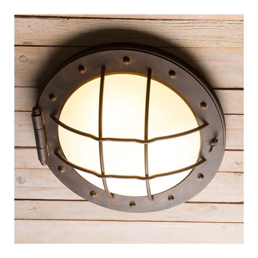 Denna infällda taklampa kombinerar robust ingenjörskonst med en distinkt maritimt inspirerad design, som påminner om klassiska porthålsarmaturer på fartyg. Dess cirkulära ram, framhävda av synliga bultar och ett skyddande metallgaller, skapar ett djärvt industriellt uttryck samtidigt som den säkerställer hållbarhet och visuellt djup.