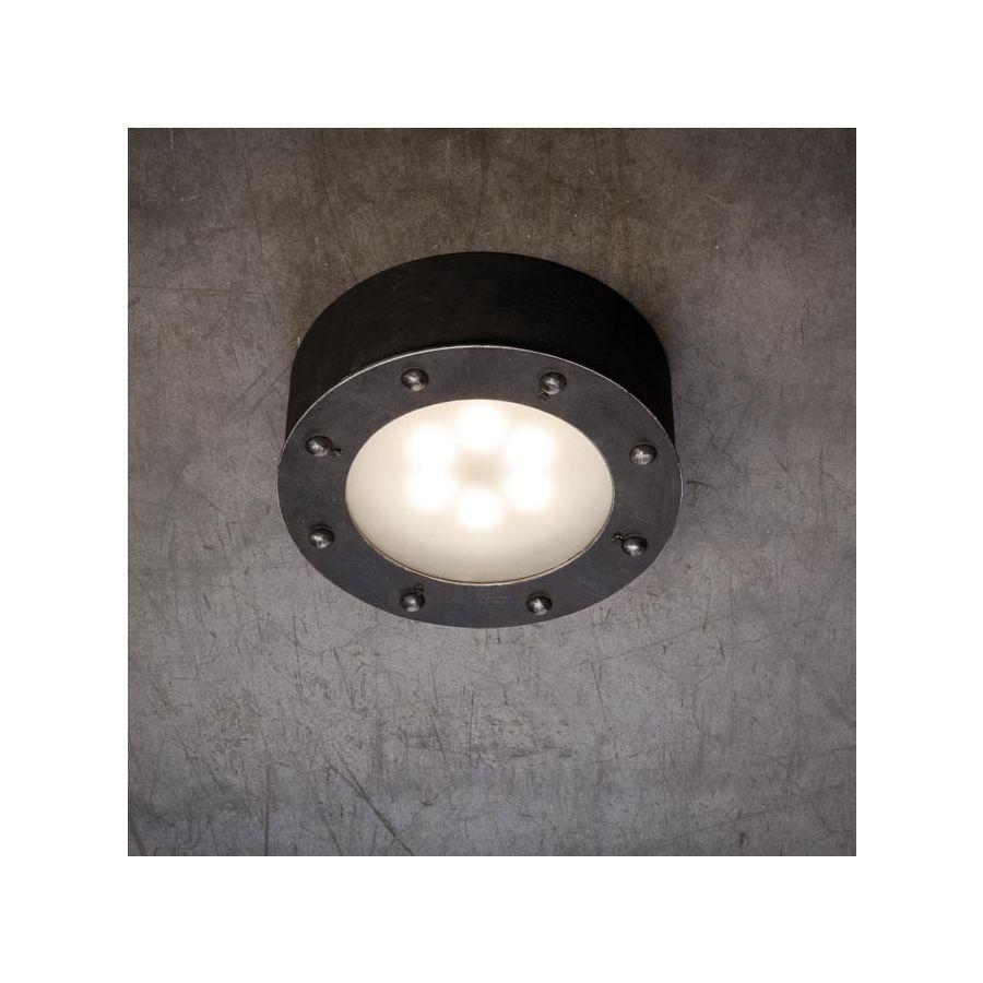Denna halvinfällda taklampa kombinerar en kompakt arkitektonisk form med en stark industriell identitet, inspirerad av klassiska porthålsarmaturer. Den cirkulära ramen med exponerade bultar skapar ett djärvt, ingenjörsmässigt utseende, vilket ger armaturen djup, struktur och en distinkt visuell närvaro.