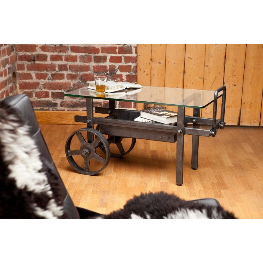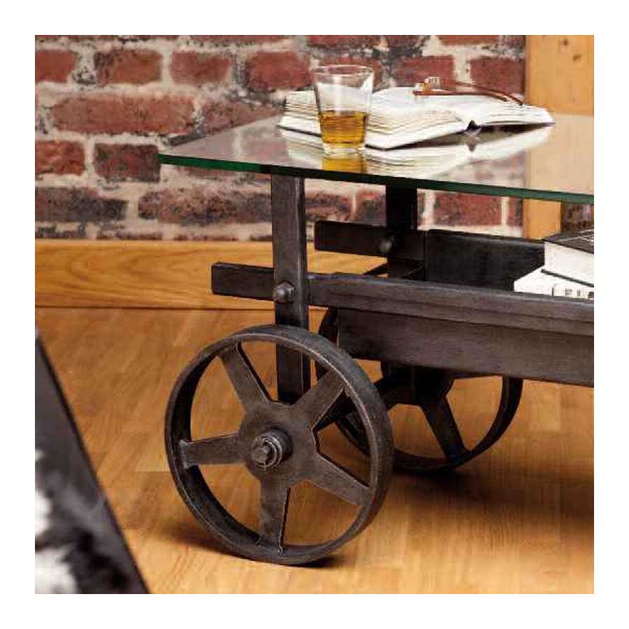 Framför allt är detta glasbord som fungerar perfekt som ett soffbord en konstruktion av mer än 2 element traditionella för denna typ av möbler. Dess stomme består av 2 klassiska ben och 2 hjul som spelar rollen av benen; hyllan, och ett dekorativt element, alla tillverkade av hårt stål. Glastoppen med rundade kanter har en klar finish. Hela bordet är handgjort.