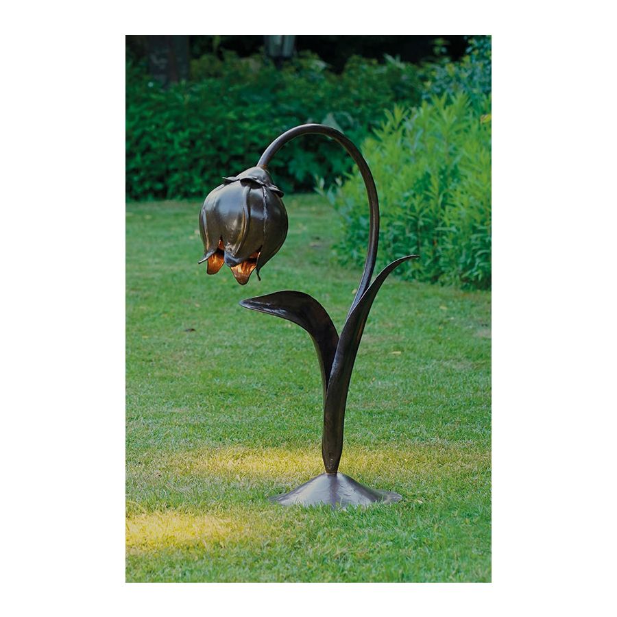 En slank, lätt böjd stam bär en skulpterad blomformad skärm, som fångar ögonblicket av en blomning i rörelse.