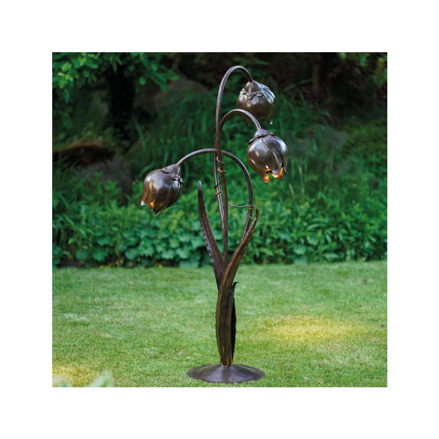 Graciöst böjda metallstjälkar reser sig från en solid bas, var och en bärande en ömt formad blomformad skärm. De tre ljuskällorna är placerade i olika höjder och vinklar, vilket skapar ett dynamiskt samspel av ljus och skugga som ger djup och atmosfär åt den omgivande ytan.