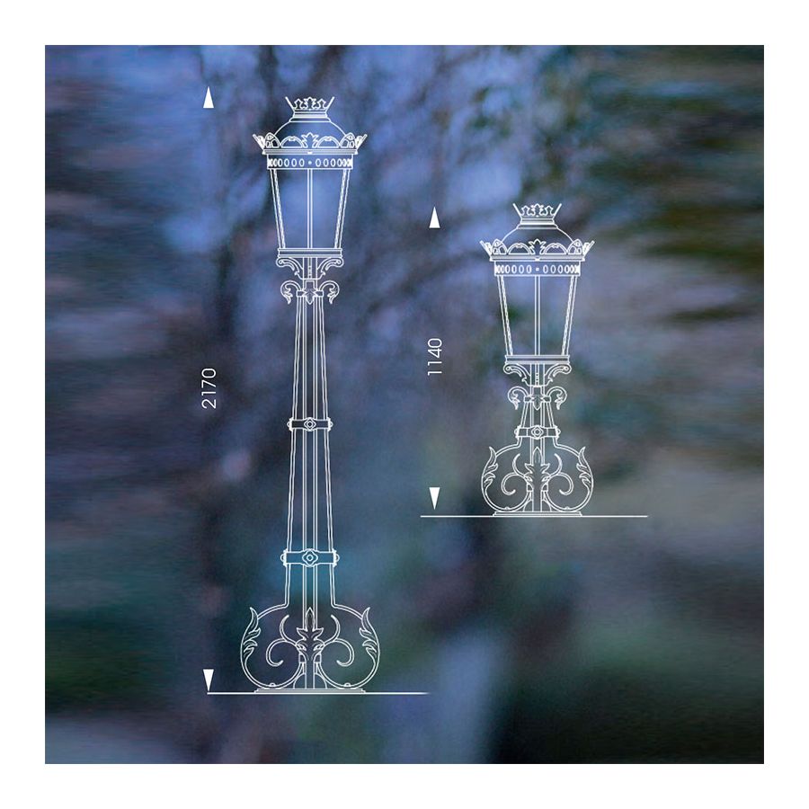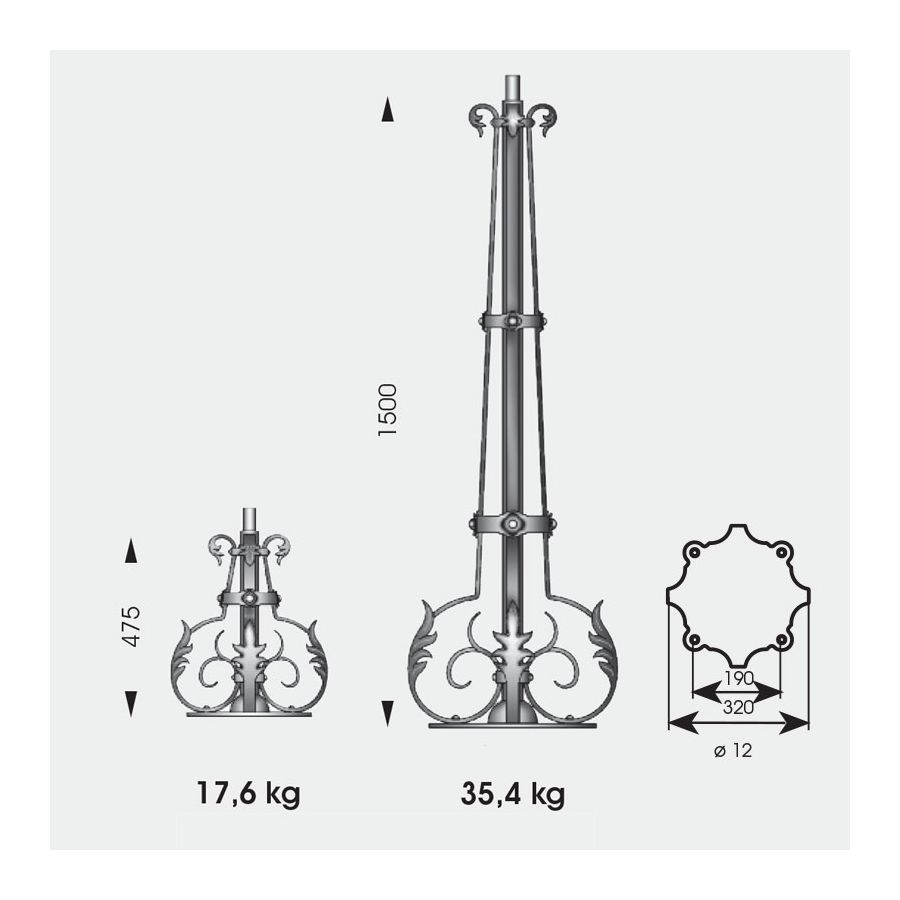 Denna exklusiva design av pelarlampa tillhör Robers (Tyskland) som är kända för att manuellt tillverka sina armaturer i järn, koppar och stål och bearbeta produkterna på ett sådant sätt att de blir hållbara samt vatten-/havsmotståndiga. Denna vackra pelarlampa är en förkroppsligande av kärlek till blommorna. Den traditionella cylindriska kolonnen är dekorerad med järnstjälkar och kronblad som bär upp skärmen i en lyktaform med ett tak rikt utsmyckat med blommor. Hela armaturen är tillverkad av smidesjärn, tillgänglig i 10 ytbehandlingar att välja mellan.