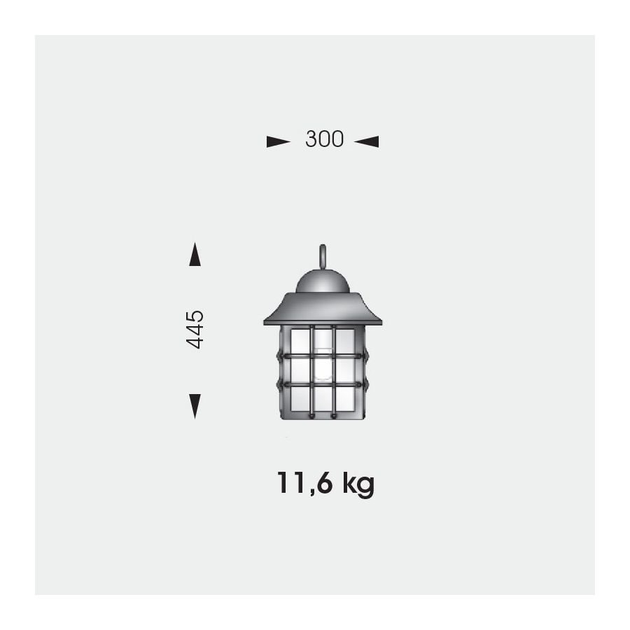 Denna pelarlampa från utomhussamlingen av Robers (Tyskland) ingår i en serie bestående av flera lampor med samma design, men med olika fäste. Denna är en fyrkantig lykta på en kort kolonn fäst vid en rund bas och täckt av ett traditionellt tak med kåpa. Lampan är helt handgjord av smidesjärn, medan lampskärmen är av munblåst glas i antik finish inramad av korslagda järnstänger. Pelarlampan är designad i en lakonisk stil utan dekoration. Den finns i 11 ytbehandlingar som appliceras för hand. Hållbar och vattenresistent för att användas i alla utomhusmiljöer.