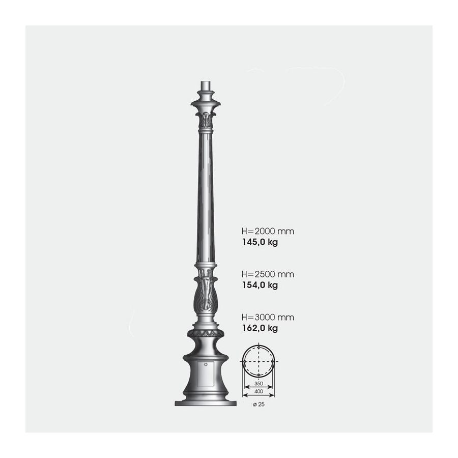 Denna pollampa från det tyska märket Robers utmärker sig genom sin höjd och en kombination av de stilar som används i dess konstruktion. Klassiska och gotiska inslag känns igen i de utsmyckade flerstegiga stolparna och hållaren. Skärmen i munblåst glas med opalfinish innehåller inte ramen, men den klotformade skärmen kröns av den eleganta flerstegs-ändknoppen i kungliga husens stil. Armaturen helt i smidesjärn,handgjord, finns i 10 ytbehandlingar, vilket ger hållbarhet och vattenbeständighet för att pryda och lysa upp uppfarten, gården eller trädgården.