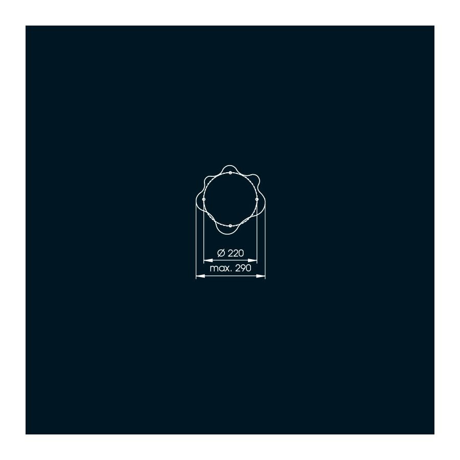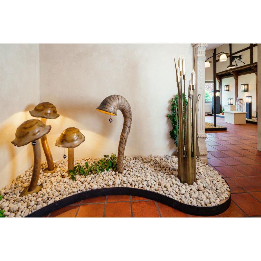 Denna pollare tillhör utomhuskollektionen från Robers (Tyskland), närmare bestämt den serie som omfattar armaturer med samma design som skiljer sig enbart i storlekarna. Denna är av medelstor storlek. En svampformad lampa består av två element: det fint böjda skaftet och huvudet. Huvudet har ett ornament typiskt för svampar. Det innehåller en övre hållare för ljuskällan och en skärm av munblåst glas med antik finish. Huvuddraget hos denna lampa är hur ljusstrålarna belyser armaturen och omgivningen: genom att reflektera från huvudets insida strömmar strålarna längs skaftet och ger ett dämpat ljus. En sådan lampa fungerar som en karaktäristisk installation för trädgården eller gården. Finns i 10 ytbehandlingar.