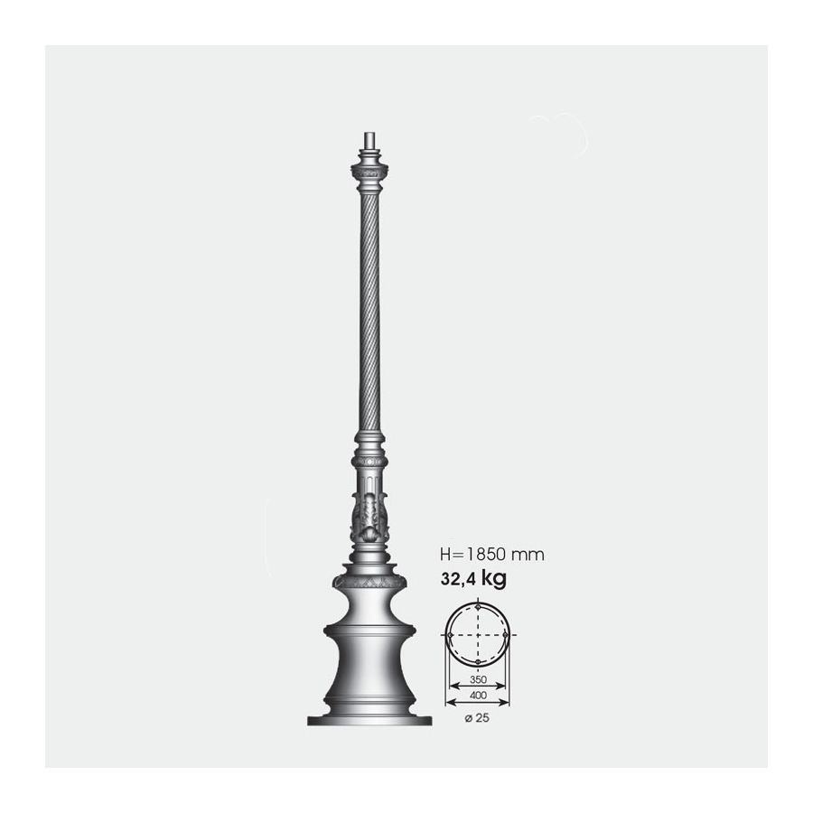 Denna pollare från Robers (Tyskland) är utformad i en verkligen urban/industriell stil. Den utmärker sig genom ett exceptionellt lakoniskt utseende: den platta runda foten, nedre och övre stolparna är inte dekorerade, liksom armen. Denna lampa sticker ut bland många andra tack vare sin höjd och funktionalitet. Dubbelarmen håller en konformad skärm. Ingen lampskärm för att täcka glödlampan.