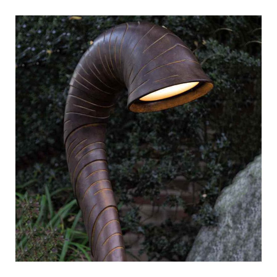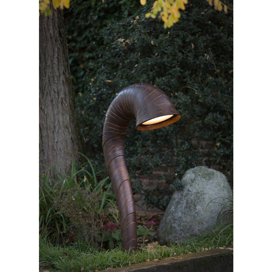 Denna utomhusstolplampa från det tyska familjemärket Robers har fått en exklusiv form. Formgivarna anser att den lakoniska lösningen kan vara ovanlig. Lampans huvuddrag är dess form. Det är ett varsamt böjt rör med en smal bas och en bredare övre del som tjänar som ljuskälla. Som vanligt arbetar smederna med hårt stål och bearbetar det på ett sätt som säkerställer hållbarhet och vattentålighet. De dekorerade ytan med karvningar som påminner om ormskinn. Ormens “huvud” täcker glödlampan. Som ett resultat behövs ingen extra lampskärm.