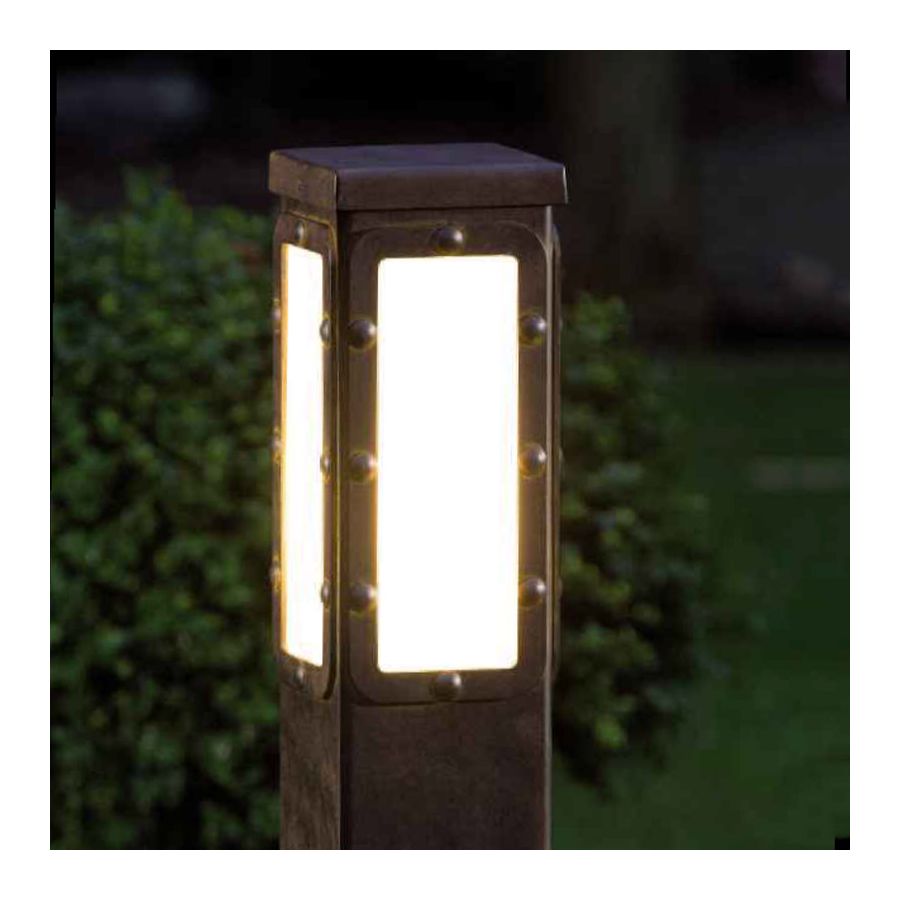 Denna postlampa från Robers (Tyskland) är tillverkad i en ren industriell stil som betonas av de geometriska linjerna och det lakoniska utförandet. Lampan av rektangulär form har sitt enda dekorativa element på ramen - de små runda nitarna. Lampkupan är handgjord av munblåst glas, frostad på insidan med en klar matt yta. Den är insatt i den rektangulära basen och täcks av ett enkelt tak.