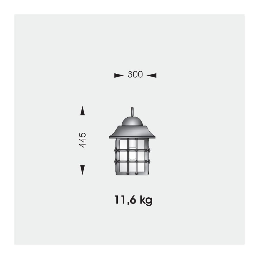 Denna höga utomhusstolplampa från Robers (Tyskland) har en lakonisk design för stolpen medan huvudfokus ligger på lanternan i kvadratisk form. Hela lampan är tillverkad av smidesjärn och kombinerar olika geometriska linjer och former. Lampskärmen av blåst glas i en antiqua-finish är dekorerad och skyddad av tunna järnstänger. Den är ansluten till armen genom en liten krok och ögla. En sådan lampa fungerar utmärkt i trädgården, på gården eller längs trottoaren. Den ger hållbarhet och vattenbeständighet. Finns i 10 ytbehandlingar att välja mellan: antik brons, antik svart, rostigt järn, terra och andra.