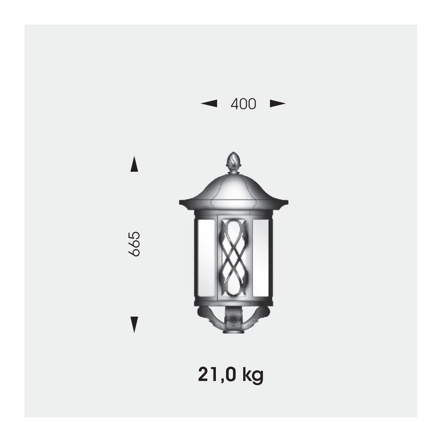 Denna eleganta höga pollare är designad av Robers (Germany) med inslag av de victorianska och gotiska stilarna. Dess runda terrasserade bas bär upp en hög elegant men stadig kolonn. Skärmen är lyktilik i en hexagonal form av munblåst glas. Fönstren är prydda med tvinnade detaljer av samma material som hela armaturen - smidesjärn. Taket är elegant krönt av en liten avslutning.