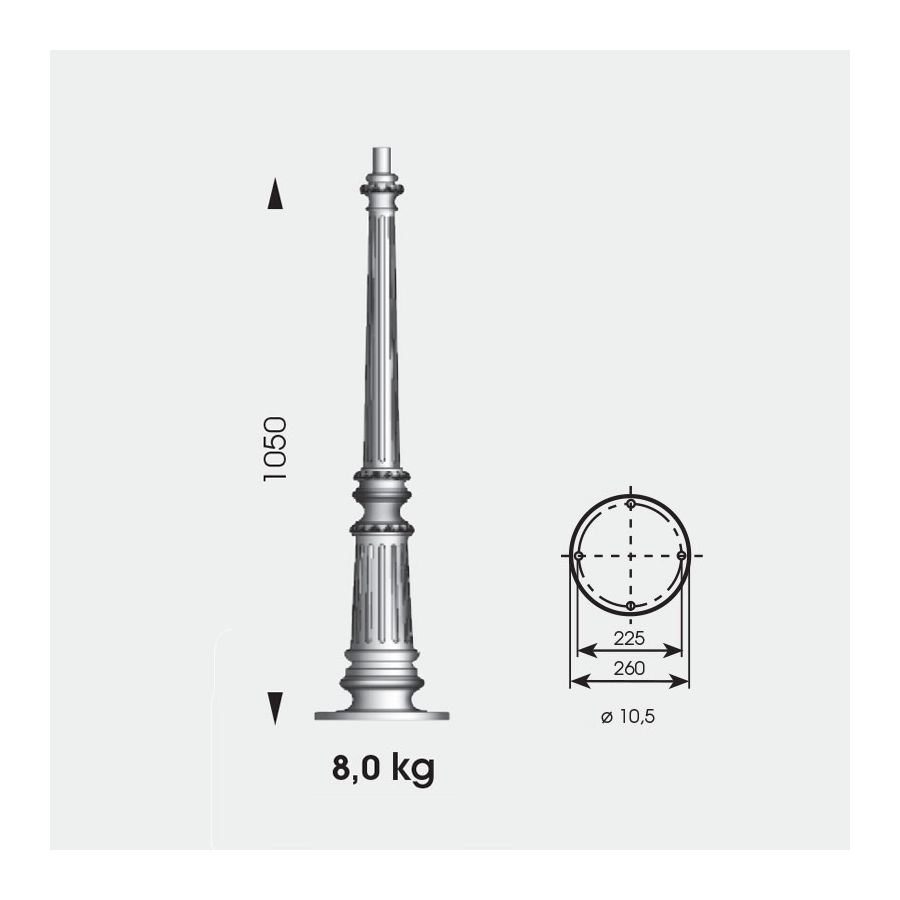 En stolplampa från Robers (Tyskland) tillhör serien av vägg-, stolp- och piedestallampor med samma design. Tillsammans bildar de en harmonisk helhet. Den trappstegsformade nedre stolpen är utsmyckad med sniderier medan den övre stolpen har en lakonisk design med sin exklusiva detalj - en krok som fungerar som arm för lanternan. Skärmen i cylindrisk lanternform är täckt av ett trumpetformigt tak med traditionella element - ventilationshål och en ventilationshuv. Materialet som används för lampan är smidesjärn, bearbetat och handmålat i 10 ytbehandlingar. Armaturen är utformad för hållbarhet och vattenbeständighet.