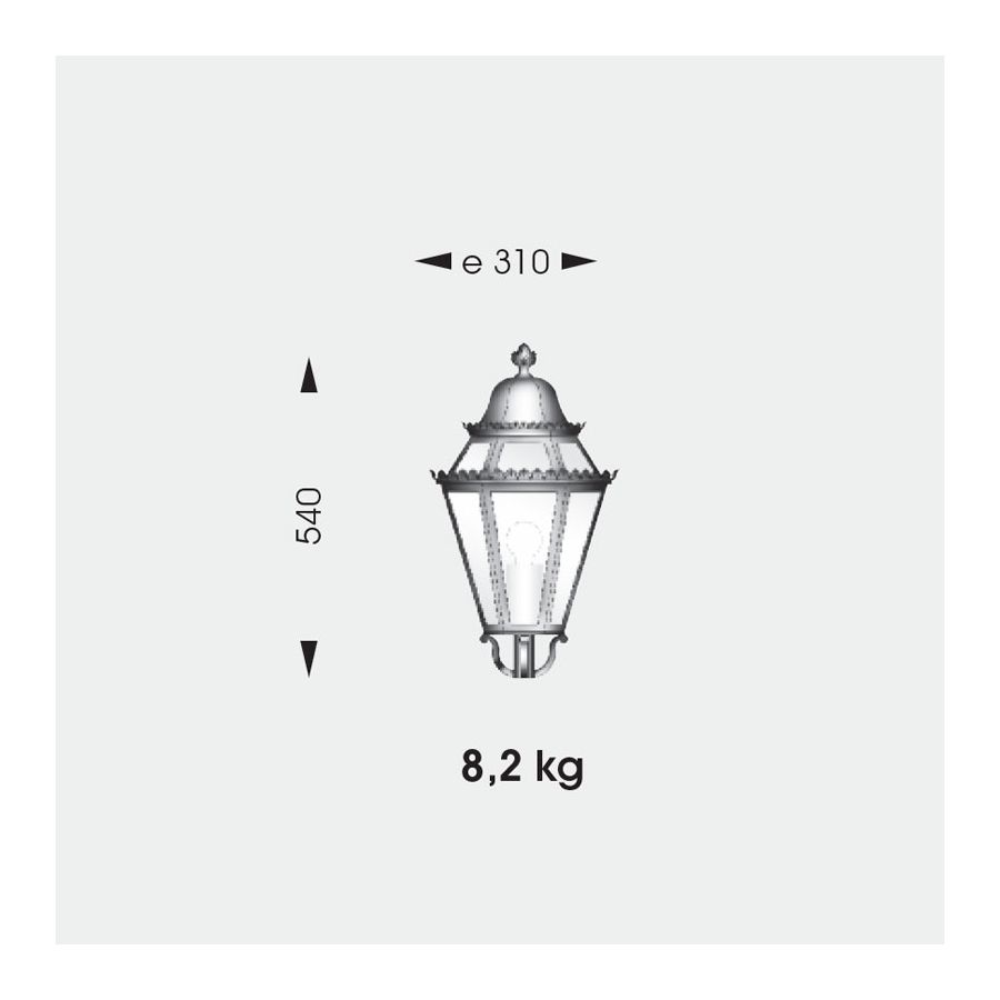Denna stolplampa, designad och tillverkad av det tyska märket Robers, har en unik design som blir ett verkligt blickfång i trädgården, framför entrén eller längs uppfarten. Tack vare det tvålagrade taket tillverkat av smidesjärn och glas, samma material som själva skärmen, ger lampan mer ljus och därmed ökad säkerhet. Skärmen inkluderar en nedre hållare för en glödlampa, inramad av lakoniska lister och krönt med en dekorativ toppprydnad. Kolumnen i båda delarna är utsmyckad med sniderier enligt klassisk tradition. Stolplyktan finns i 10 ytbehandlingar, applicerade för hand, hållbara och vattenresistenta.