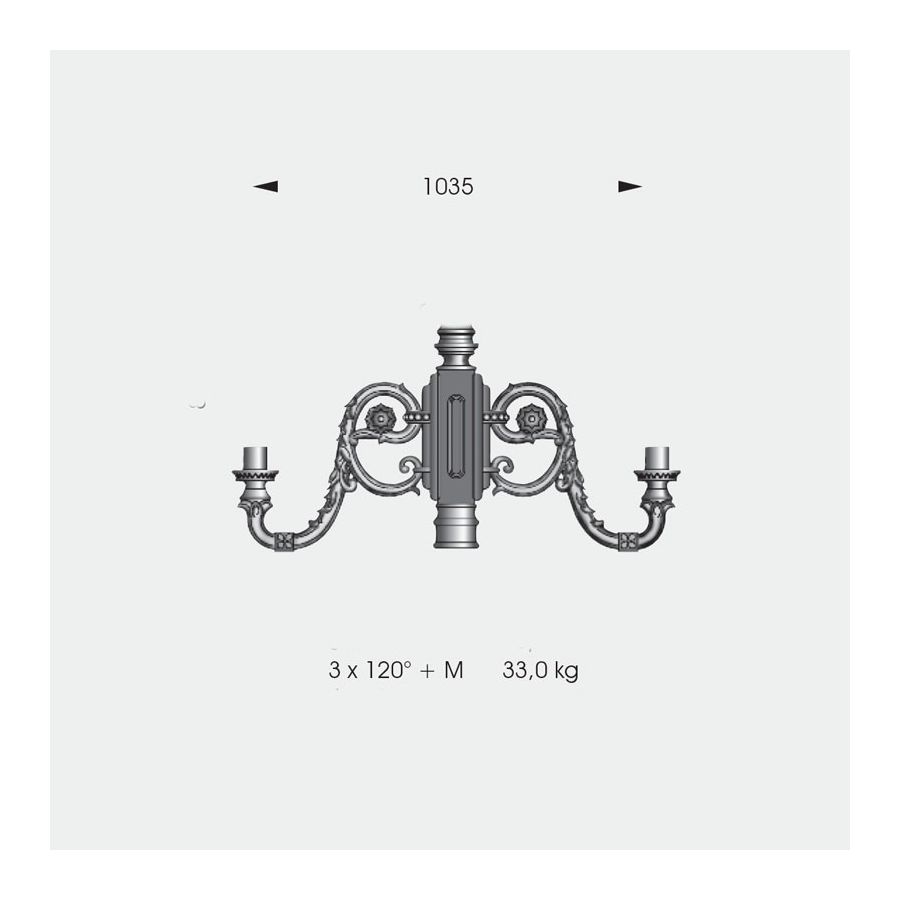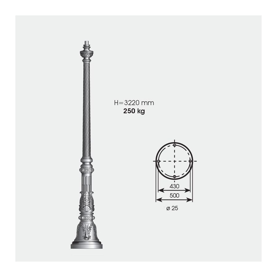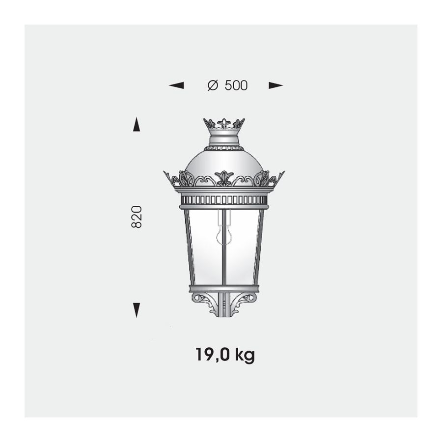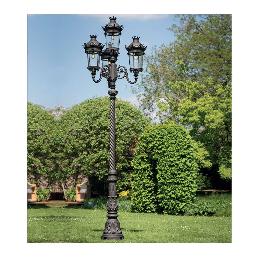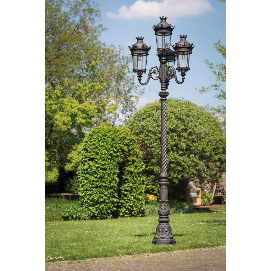 Denna klassiska pollare tillhör utomhussortimentet från det tyska märket Robers vars armaturer är handgjorda av järn, stål och koppar som bearbetats på olika sätt för att bli hållbara och vattenresistenta, vilket är viktigt för utomhusbruk. Denna pollare utmärker sig genom sin ovanligt stora höjd och kraftfulla ljuskälla som utgörs av fyra lyktor. Den är solid och massiv i den nedre delen, kolumnen är rikt utsmyckad med karvning med blomsterinslag. Skärmarna på varje lykta av blåsigt glas är tonade till en antik finish och täcks av tak som behåller samma dekorationsstil, vilket visar att hela designen är inspirerad av viktoriansk och klassisk stil. Armaturen finns i 12 ytbehandlingar att välja mellan.